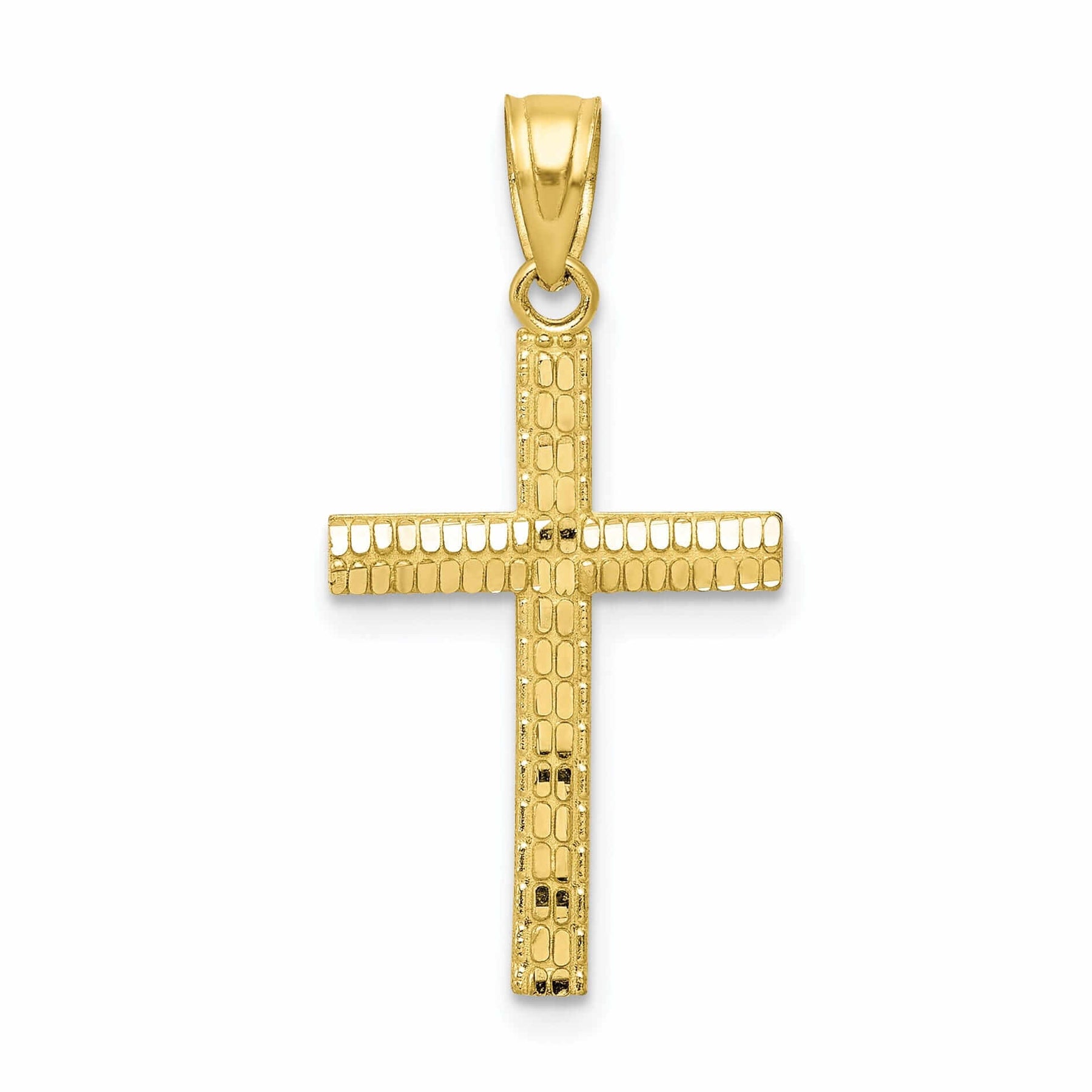 Elevate your style with this elegant 10k Yellow Gold Polished Cross Pendant. Crafted with exquisite attention to detail, this pendant features a polished finish that radiates a brilliant shine. The textured back adds a touch of uniqueness to the design, creating a piece that stands out from the rest.