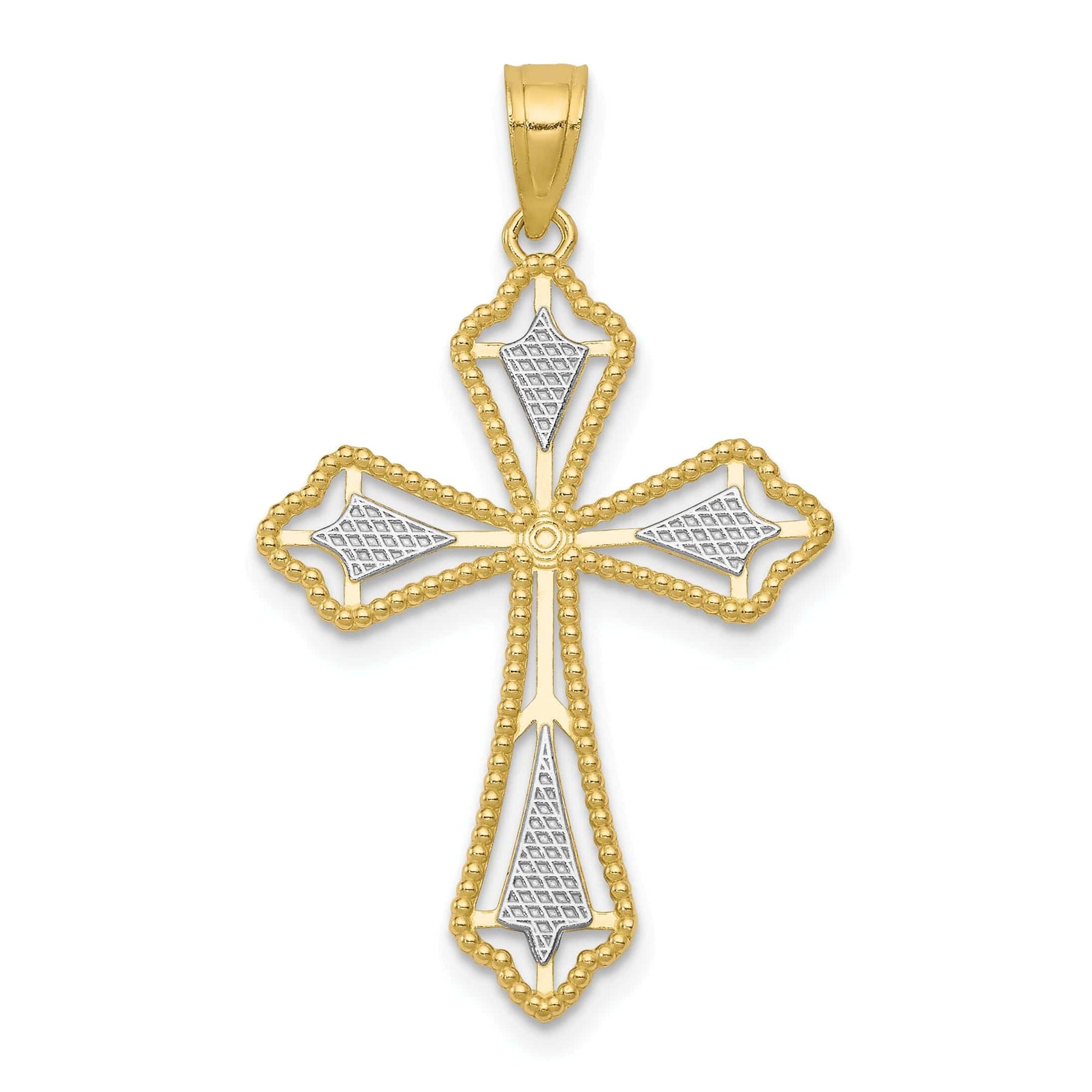 Enhance your style with this stunning Yellow Rhodium Polished Cross Pendant. Crafted from high-quality 10k yellow gold and polished with rhodium, this pendant exudes luxury and elegance. With an average weight of 0.84 grams and a width of 21mm, this piece is the perfect size to make a statement without being overpowering.