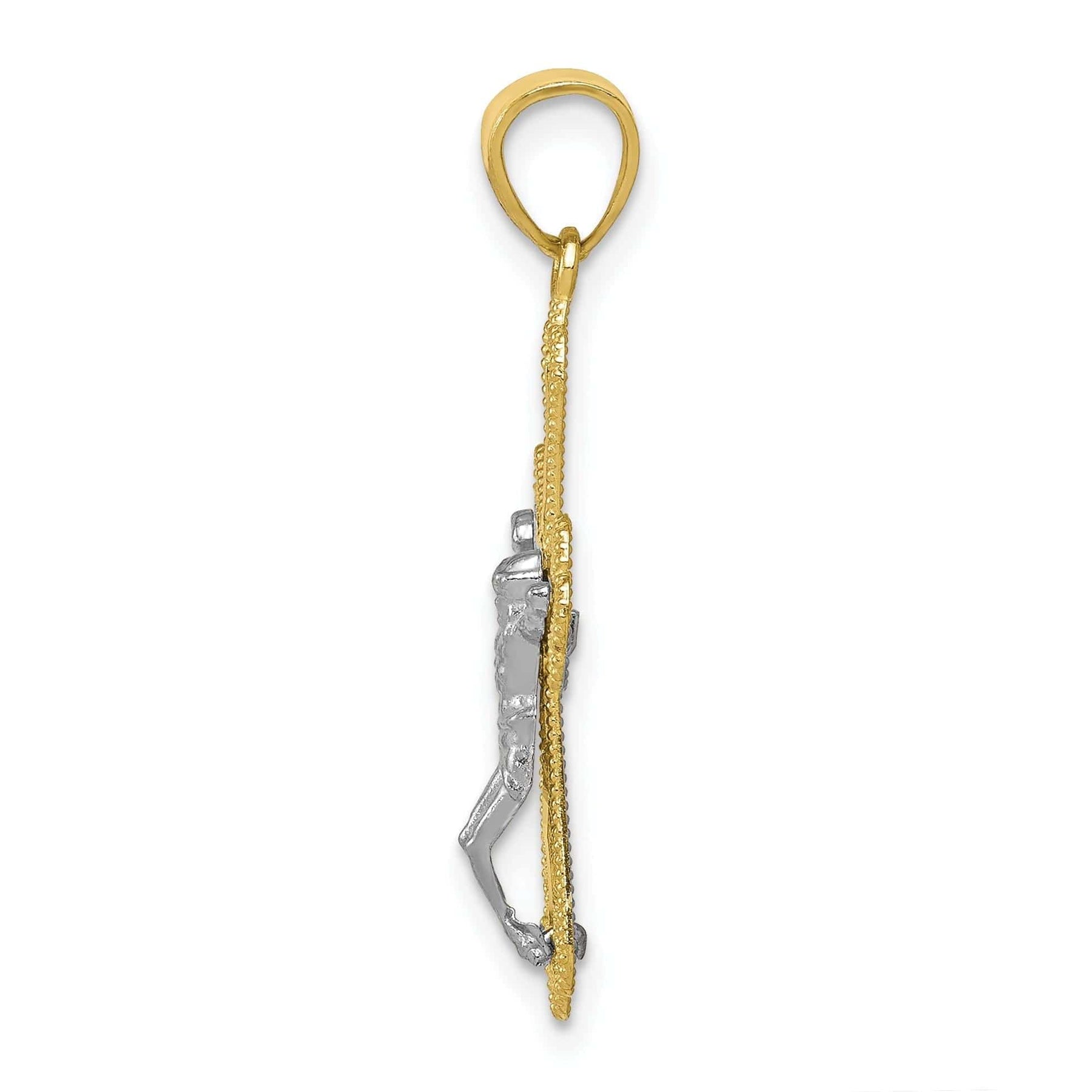 Elevate your everyday look with this stunning 10k Two Tone Gold Filigree Crucifix Pendant. This intricately designed pendant features a combination of polished gold and rhodium finishes, creating a unique and eye-catching design. The filigree detailing adds a touch of elegance and sophistication to this religious charm.
