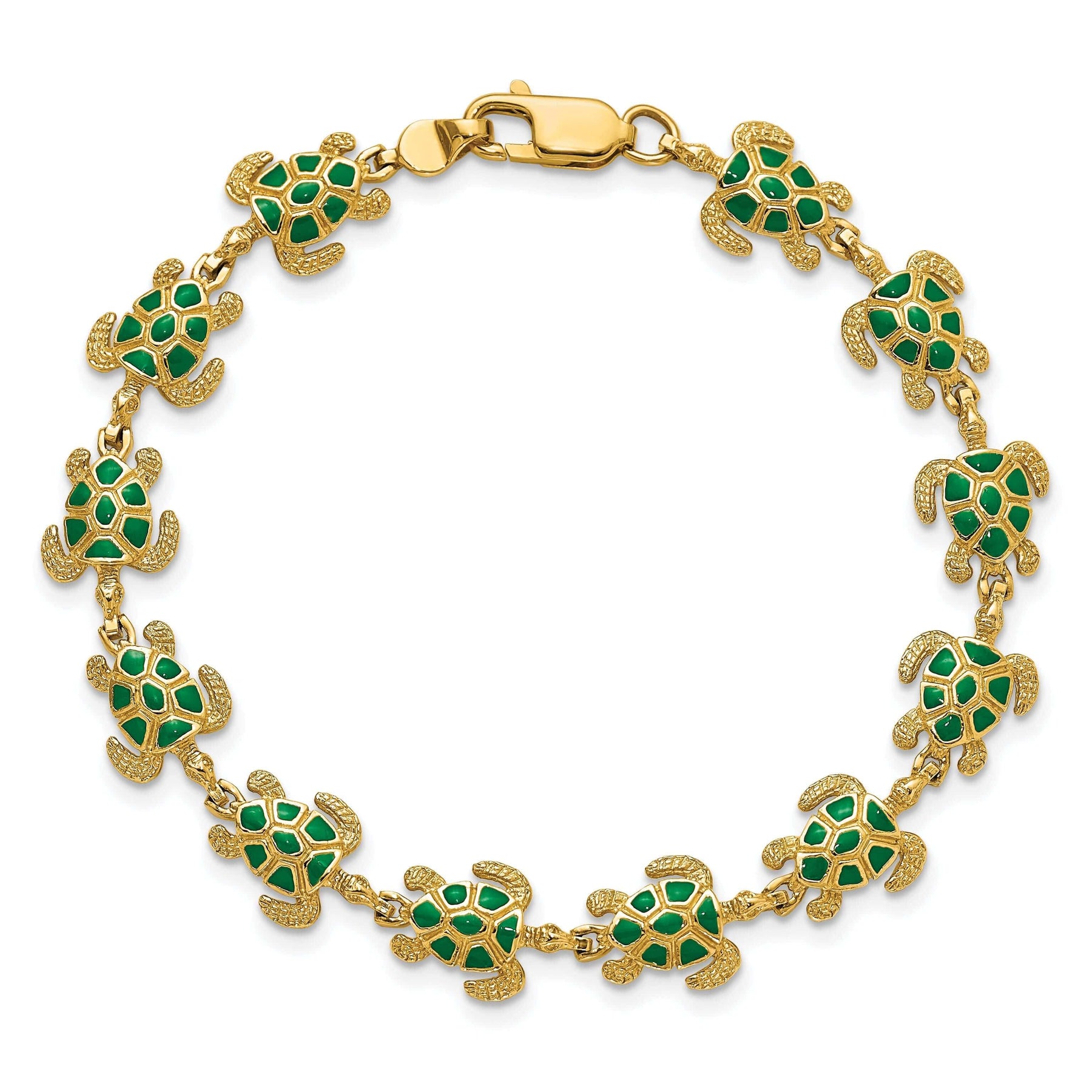 "Green Enamel 14K Gold Sea Turtle Bracelet - Lobster Clasp"