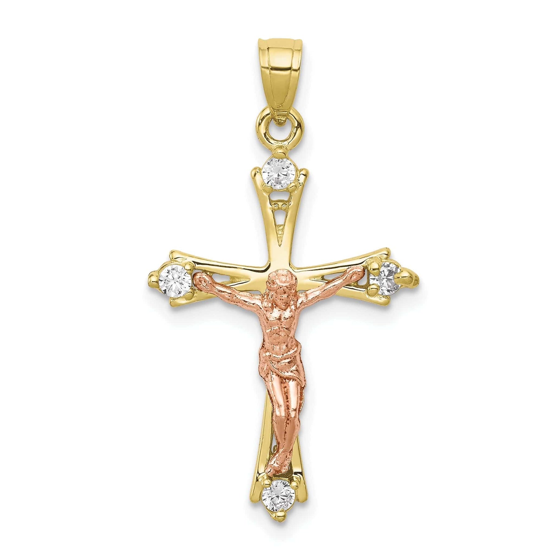 Add a touch of elegance and faith to your jewelry collection with this stunning Polished Two-tone Cubic Zirconia Crucifix Pendant. Crafted from 10k two-tone gold, this pendant features a beautifully detailed crucifix design adorned with shimmering cubic zirconia stones.