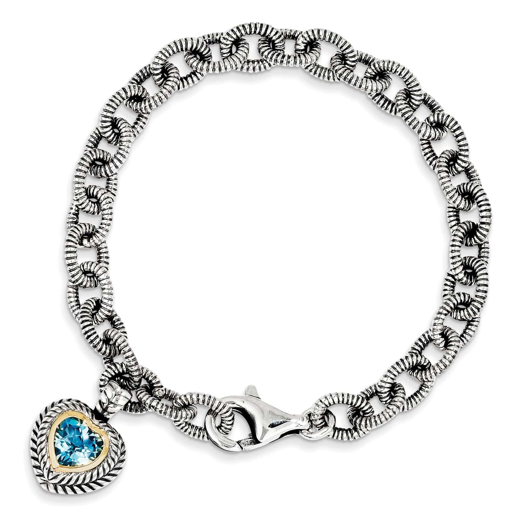 The 7.5-inch length of the bracelet ensures a comfortable fit for most wrist sizes, and the secure clasp ensures that it will stay in place all day long. Whether worn alone as a statement piece or paired with other bracelets for a stacked look, this Sterling Silver with 14k Yellow Gold Blue Topaz Heart Bracelet is sure to become a cherished addition to your jewelry collection.