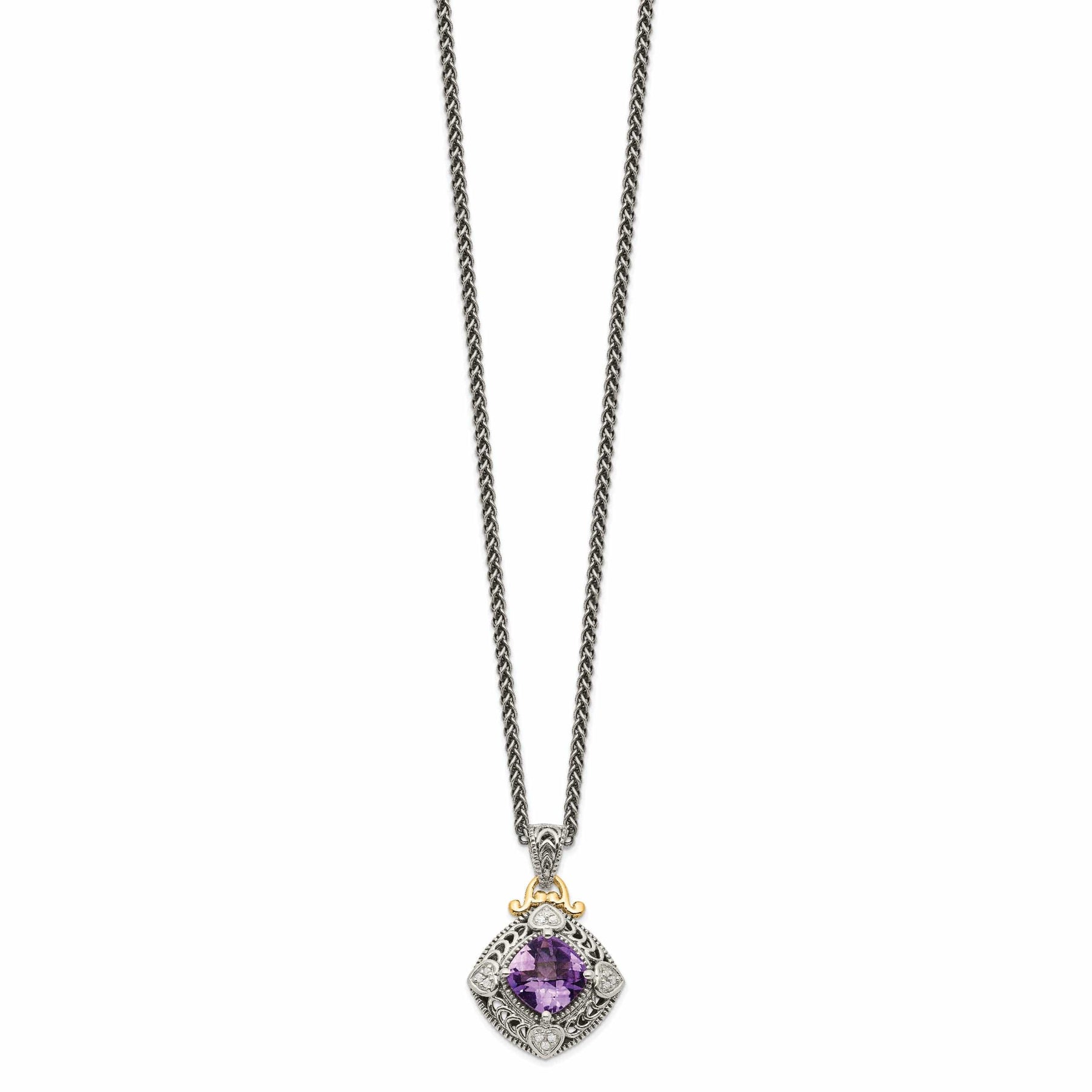 Indulge in the ultimate luxury with our stunning Sterling Silver Gold Diamond Amethyst Necklace. This exquisite piece features a beautiful combination of sterling silver and 14k yellow gold, creating a timeless and elegant design. The necklace is adorned with shimmering diamonds that add a touch of sparkle, while the amethyst gemstone adds a pop of rich color.