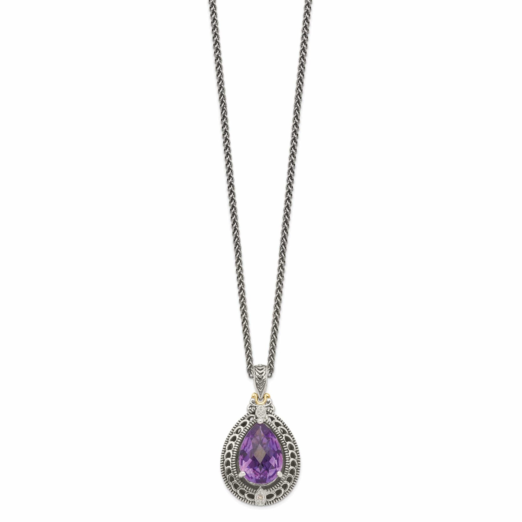 Elevate your style with this luxurious Sterling Silver Gold Diamond Amethyst Necklace. Crafted with precision, this stunning piece features a combination of sterling silver and 14k yellow gold, creating a captivating contrast that is sure to turn heads. The necklace is adorned with dazzling diamonds and a regal amethyst gemstone, adding a touch of elegance and sophistication.