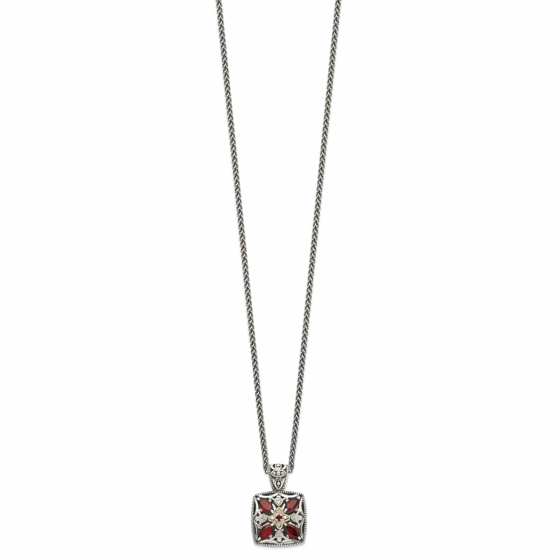 Elevate your style with the Sterling Silver Gold Diamond Garnet Necklace. Treat yourself or someone special to this exquisite piece of jewelry that will be cherished for years to come.
