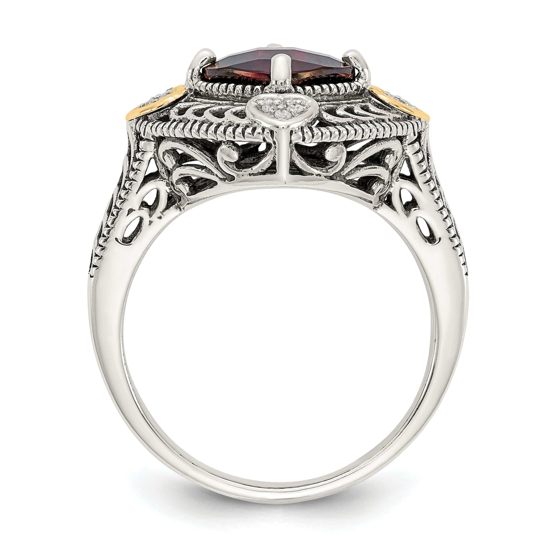 This Sterling Silver with 14k Yellow Gold Diamond Garnet Ring is a versatile piece that can be worn on its own for a subtle touch of sparkle, or stacked with other rings for a bolder look. It also makes a thoughtful and romantic gift for a loved one, symbolizing love, prosperity, and passion. Elevate your jewelry collection with this exquisite ring that radiates sophistication and charm. Order yours today and add a touch of luxury to your every day.