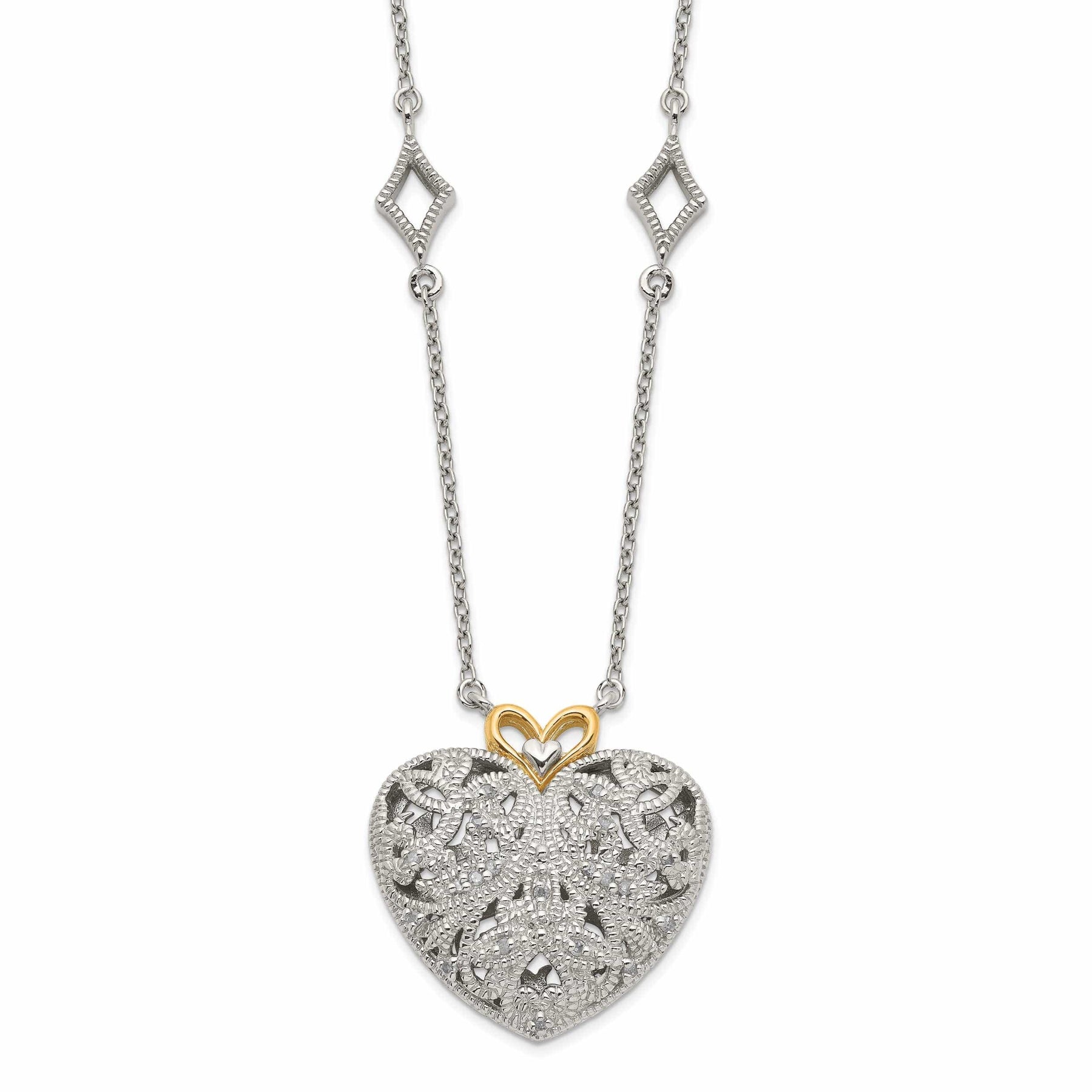 Dazzle and delight with this charming and romantic necklace, perfect for gifting to a loved one or treating yourself to a special piece of jewelry that you'll treasure for years to come. Make a statement with this timeless and elegant piece that will become a staple in your jewelry collection. Order now and add a touch of glamour to any ensemble with the Sterling Silver Gold Diamond Heart Necklace.