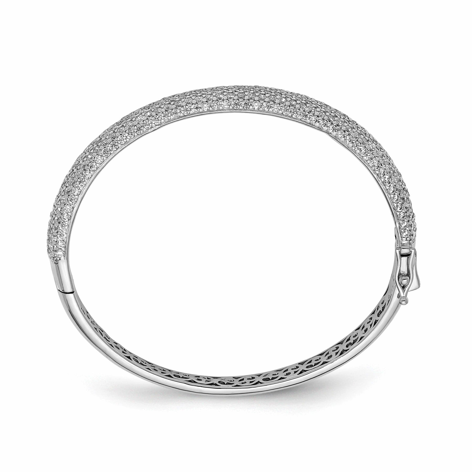 Introducing our exquisite Sterling Silver Pave 384 Stone CZ Bangle, a stunning piece that will add sophistication and elegance to any outfit. Crafted from high-quality sterling silver and pave rhodium plated for a luxurious finish, this bangle is the perfect accessory for those who appreciate fine craftsmanship and timeless style.