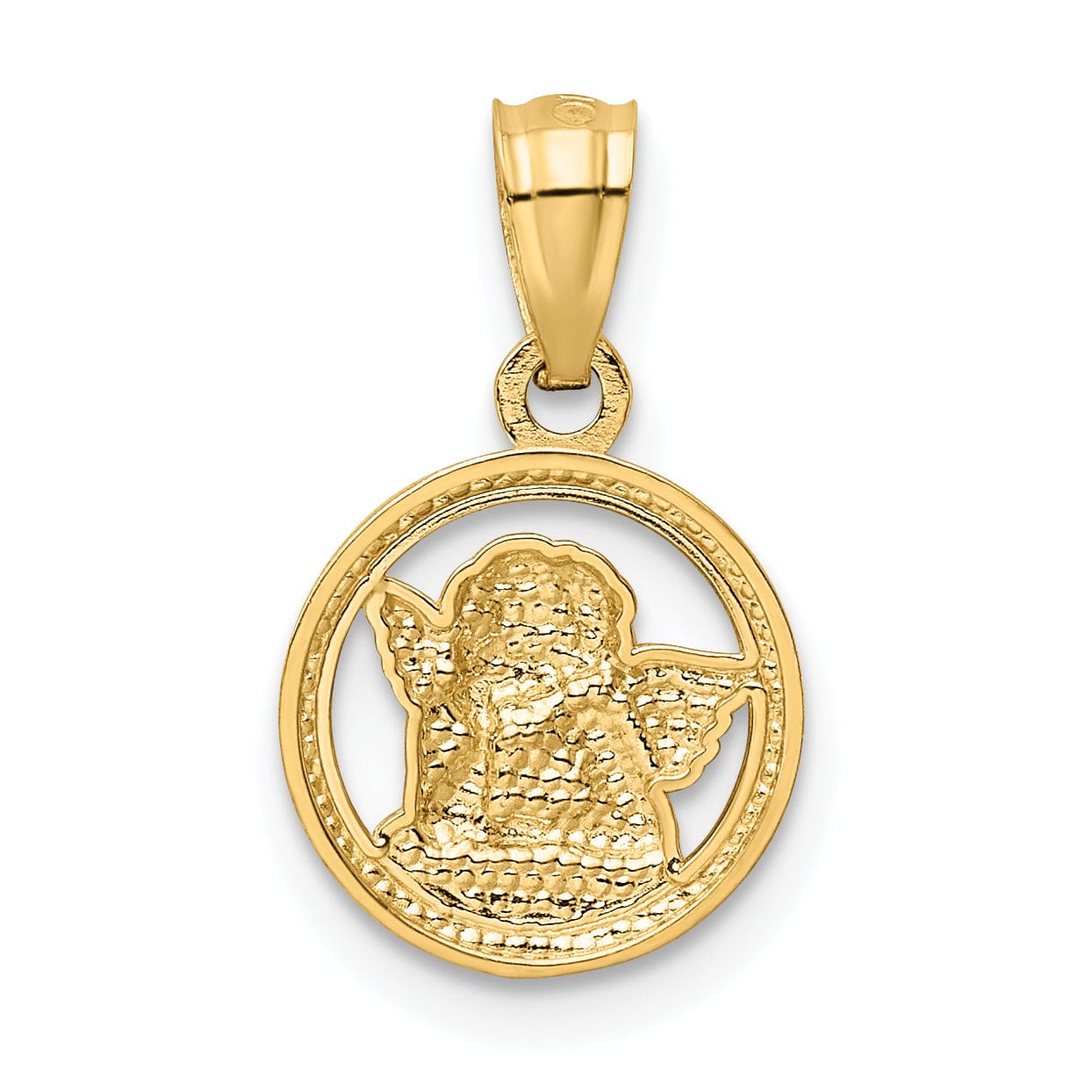 Elevate your jewelry collection with this stunning 14K yellow gold and white rhodium polished angle cherub pendant. Crafted with precision and attention to detail, this charming piece features a diamond-cut finish that adds a touch of sparkle and dimension. The round shape and solid flat back design give this pendant a timeless appeal that will complement any outfit.