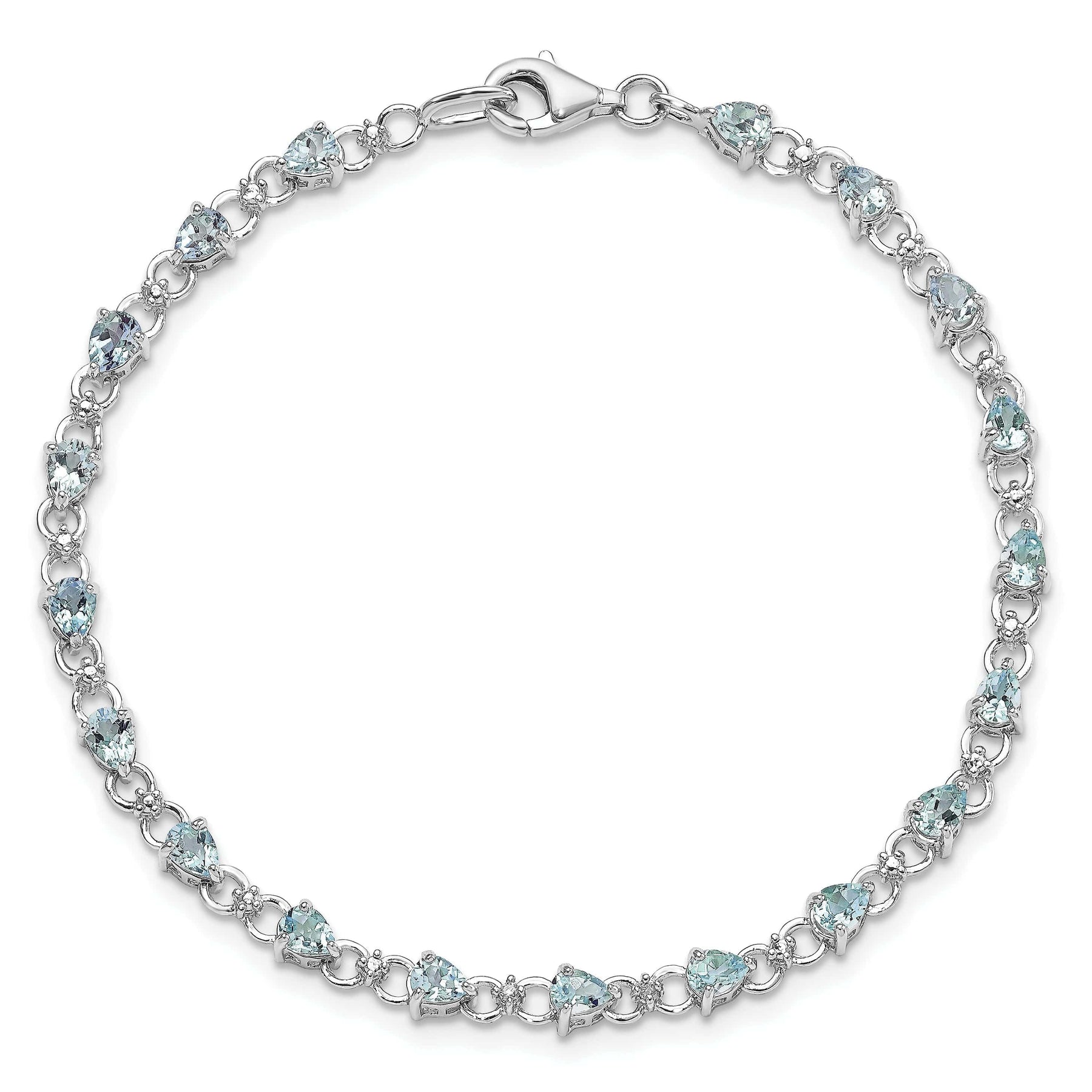 The focal point of this bracelet is the dazzling 4x3-mm pear shape aquamarine gemstone, boasting a total carat weight of 2.24 ctw. The aquamarine gemstone showcases a stunning light blue hue and impeccable clarity, making it a true statement piece. Surrounding the aquamarine gemstone are exquisite round shape diamonds with a total carat weight of 0.02 ctw. These diamonds are of i2 clarity and I-J color, adding a touch of sparkle and brilliance to the bracelet.