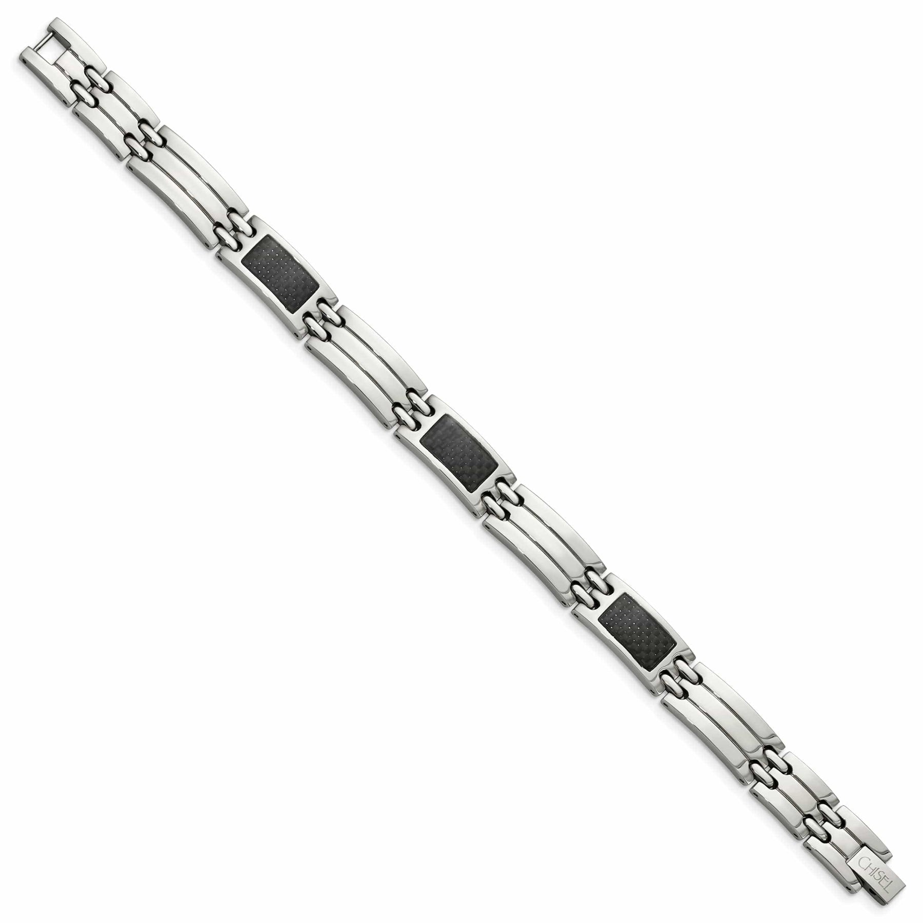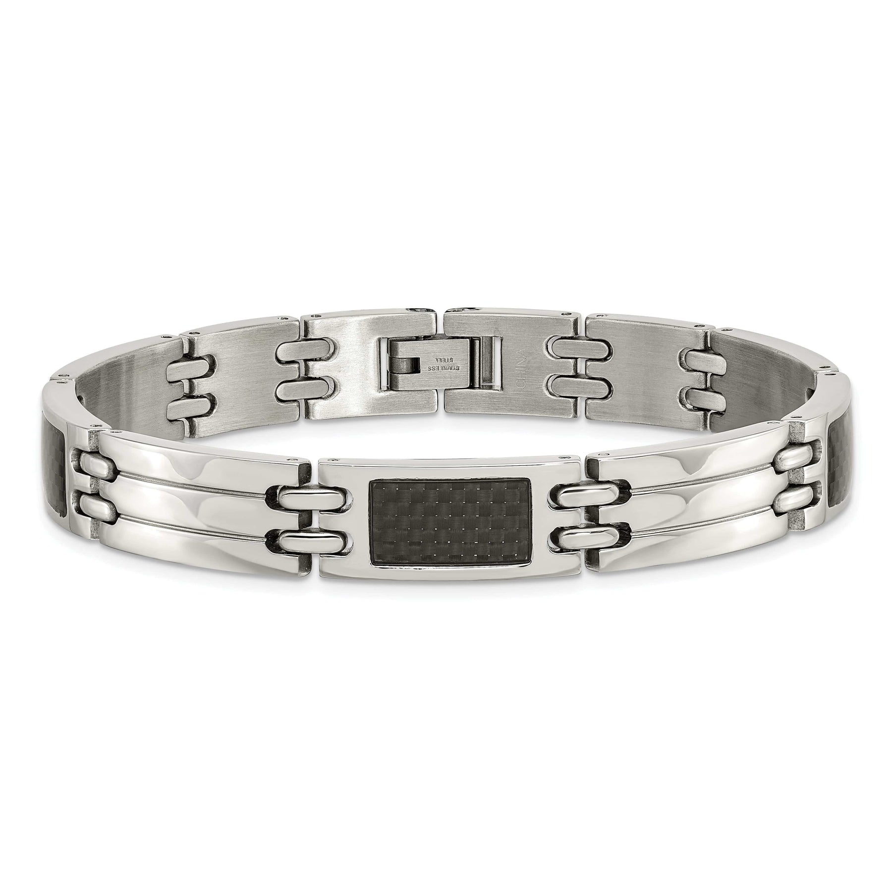 Whether you're dressing up for a special occasion or simply looking to add a touch of modern elegance to your everyday ensemble, the Stainless Steel Black Carbon Fiber Bracelet is the must-have accessory for the modern man or woman. Make a bold statement with this sophisticated and versatile piece that will surely become a staple in your accessory collection. Elevate your style with our Stainless Steel Black Carbon Fiber Bracelet today.