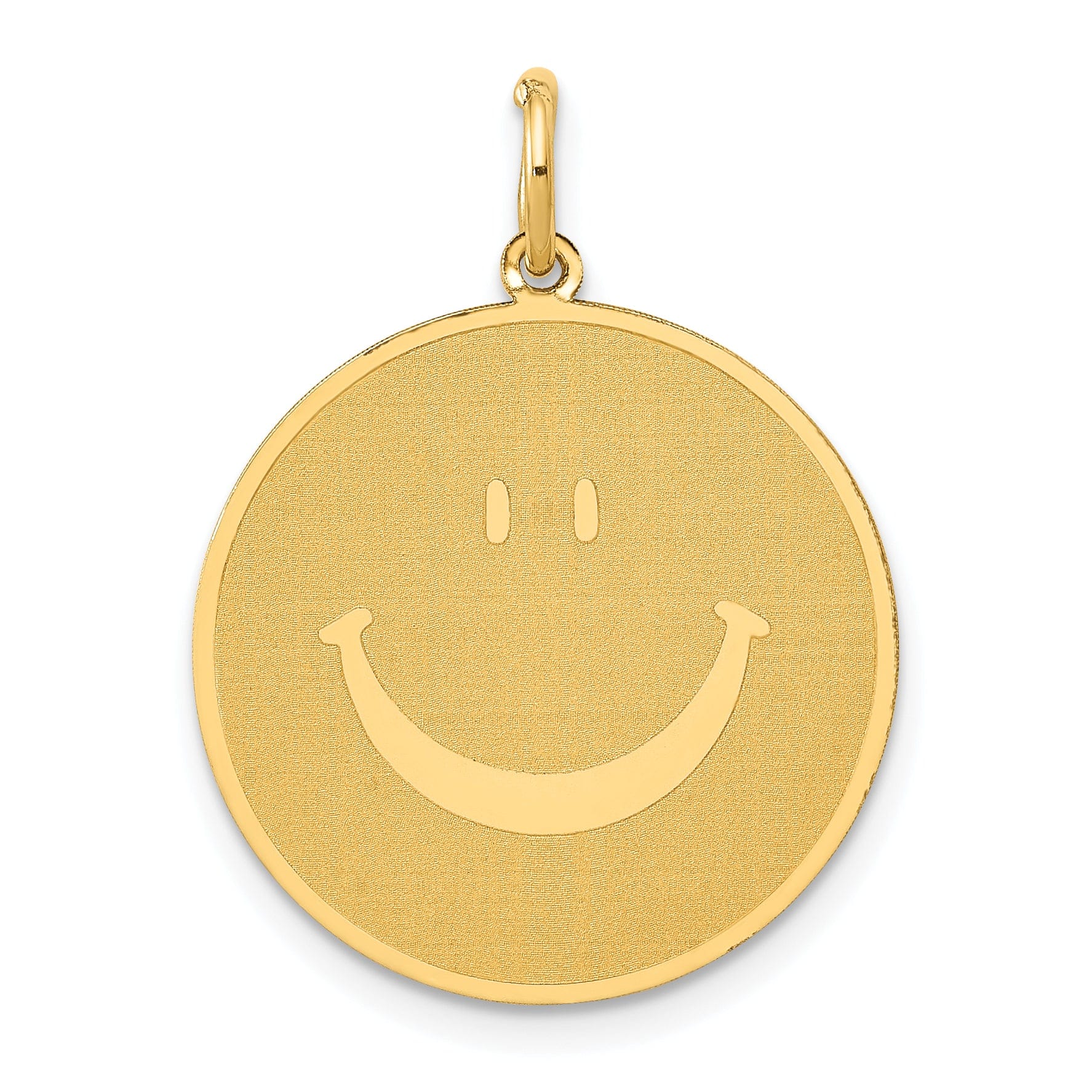 Introducing our charming 14k Yellow Gold Solid Smiley Face Charm Pendant! This delightful piece features a die struck stamped design with a brocaded texture finish, giving it a unique and eye-catching look. Made from luxurious 14k yellow gold, this pendant has a solid polished shine that will surely catch the light with every movement.
