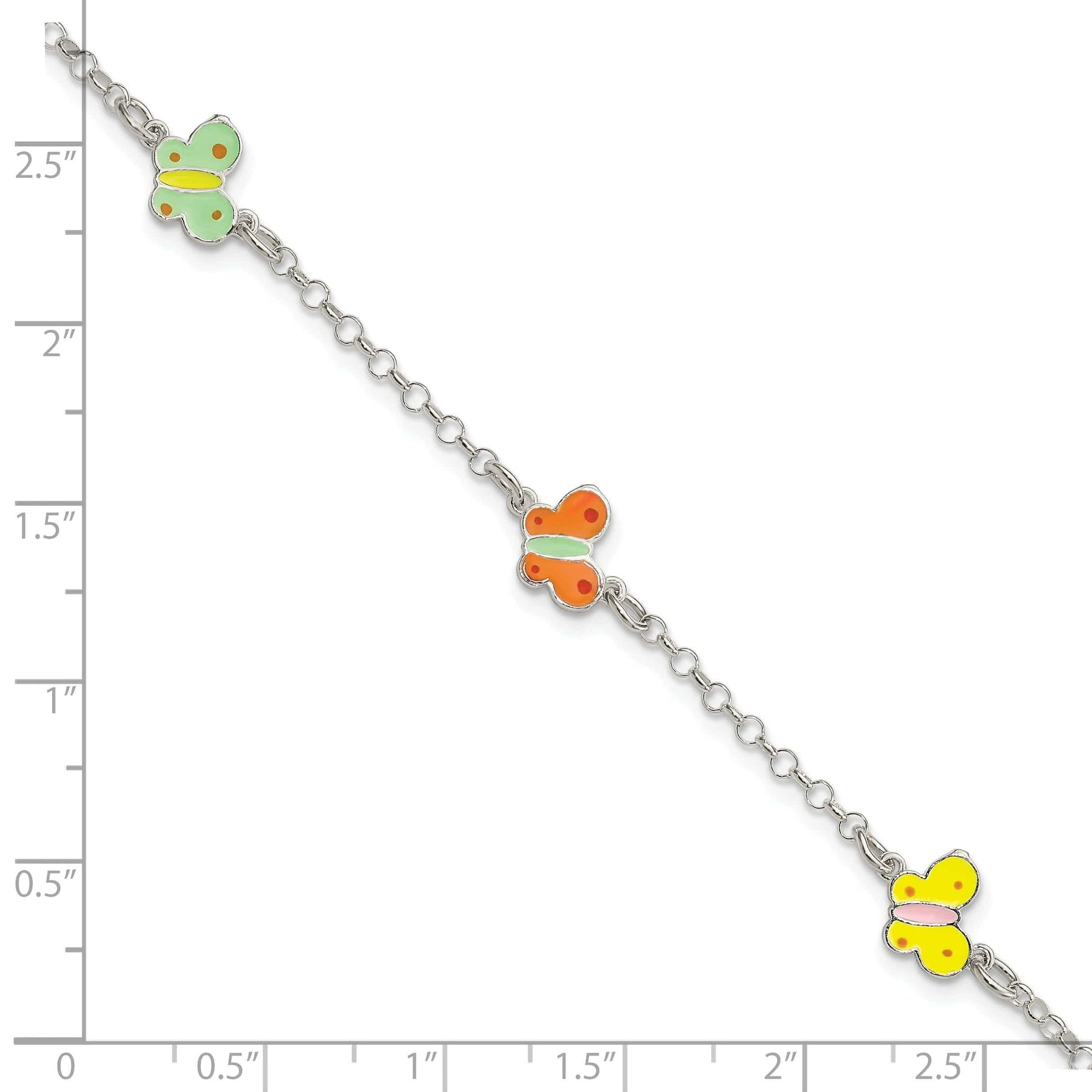 Introducing our stunning Sterling Silver Children's Enameled Butterfly Bracelet, a beautiful and delicate piece of jewelry that is sure to make any little girl feel special. This bracelet features a polished finish for a shiny and elegant look that will add a touch of glamour to any outfit.
