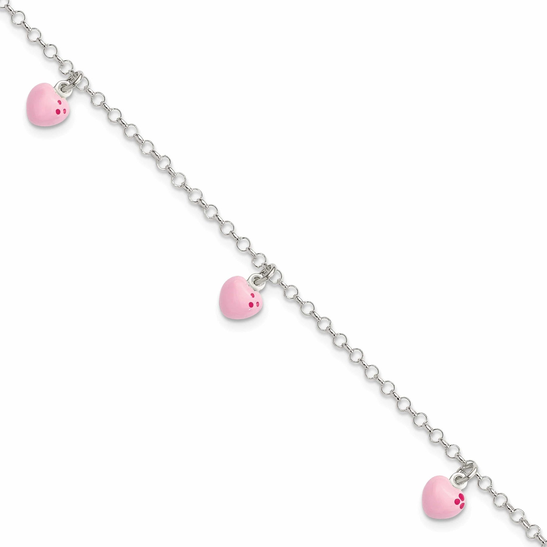 This Sterling Silver Polished Finish Children's Enameled Dangle Heart Bracelet is the perfect accessory for any young girl who loves to add a touch of charm and style to her outfit. Made with high-quality sterling silver, this bracelet features a polished finish that adds a shiny, elegant touch to any ensemble.