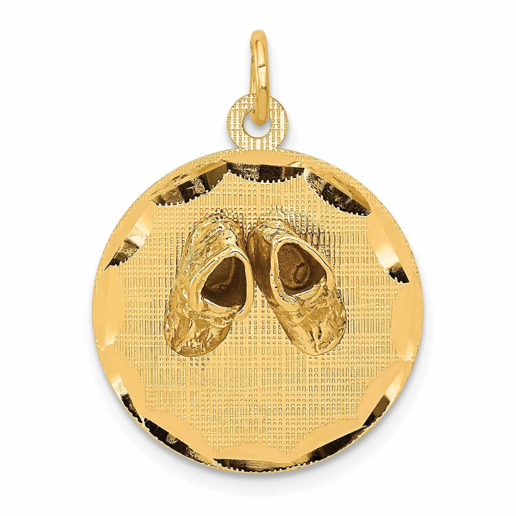 The pendant features a polished diamond-cut finish that adds a touch of sparkle and elegance to the design. The flat back design makes it comfortable to wear and the solid engravable casted small baby shoes on the disc charm pendant adds a touch of sentimental value to this piece.