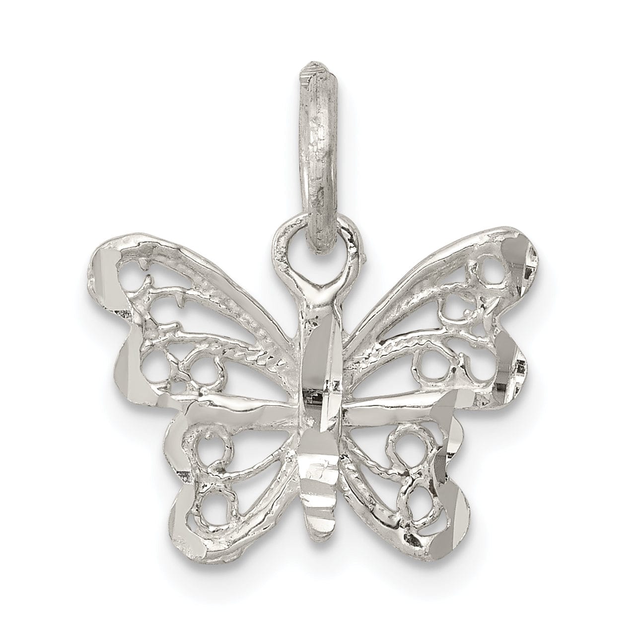 Add a touch of whimsical beauty to your jewelry collection with this stunning Sterling Silver Polished Finish Butterfly Charm Pendant. Crafted from solid sterling silver, this delicate charm features a polished finish and intricate diamond cut textured details that bring the enchanting butterfly to life.