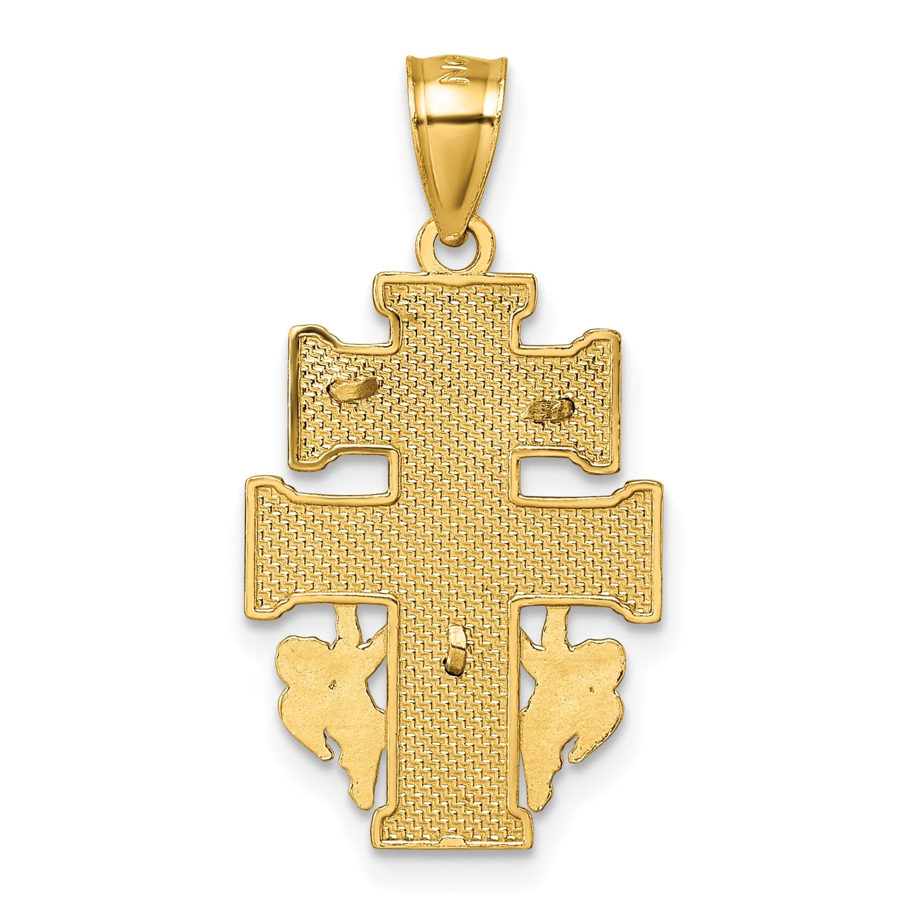 Introducing the stunning 14K Yellow Gold Ornate Textured Cara Vaca Crucifix Pendant. Crafted from solid 14K yellow gold, this pendant features an elegant polished finish and intricate textured details, making it a beautiful statement piece. Weighing 2.28 grams and measuring 28.6 mm in length and 15.5 mm in width, it offers a substantial yet refined presence. The crucifix is equipped with a bail measuring 5.8 mm in length and 3.7 mm in width, ensuring easy attachment to your favorite chain. Elevate your jewelry collection with this timeless symbol of faith and artistry.