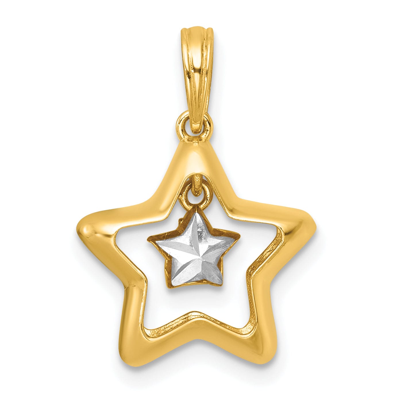 Elevate your jewelry collection with our stunning 14k Two Tone Gold Polished Star in Star Dangle Pendant. Crafted from solid 14K yellow gold and adorned with a radiant white rhodium finish, this exquisite piece showcases a unique star design that adds a touch of elegance to any outfit. Weighing 1.42 grams and featuring a refined polished finish, this pendant measures 21.45 mm in length and 15.3 mm in width, making it a perfect statement accessory. The hollow bail provides effortless hanging, while the total thickness of 4.53 mm ensures durability. Shine bright with this beautiful pendant.