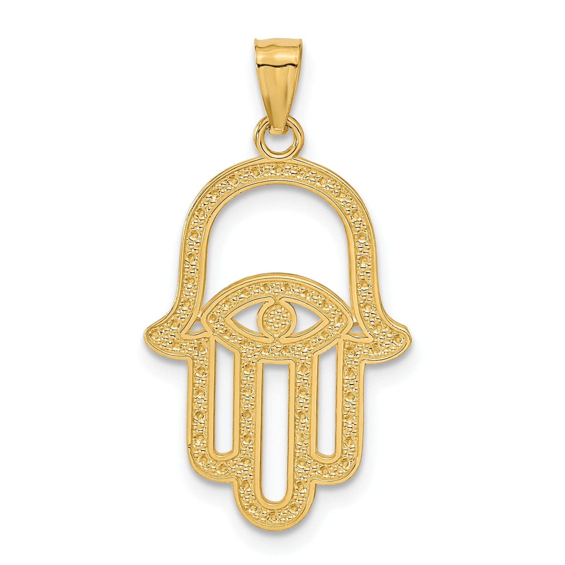 Perfect for everyday wear or special occasions, this solid Hamsa charm pendant makes a thoughtful gift for yourself or a loved one. Treat yourself to something special with this beautifully crafted piece that is sure to be treasured for years to come. Add a touch of elegance to your ensemble with this stunning 14K Yellow Gold Rhodium Polished Texture Finish Solid Hamsa Charm Pendant.