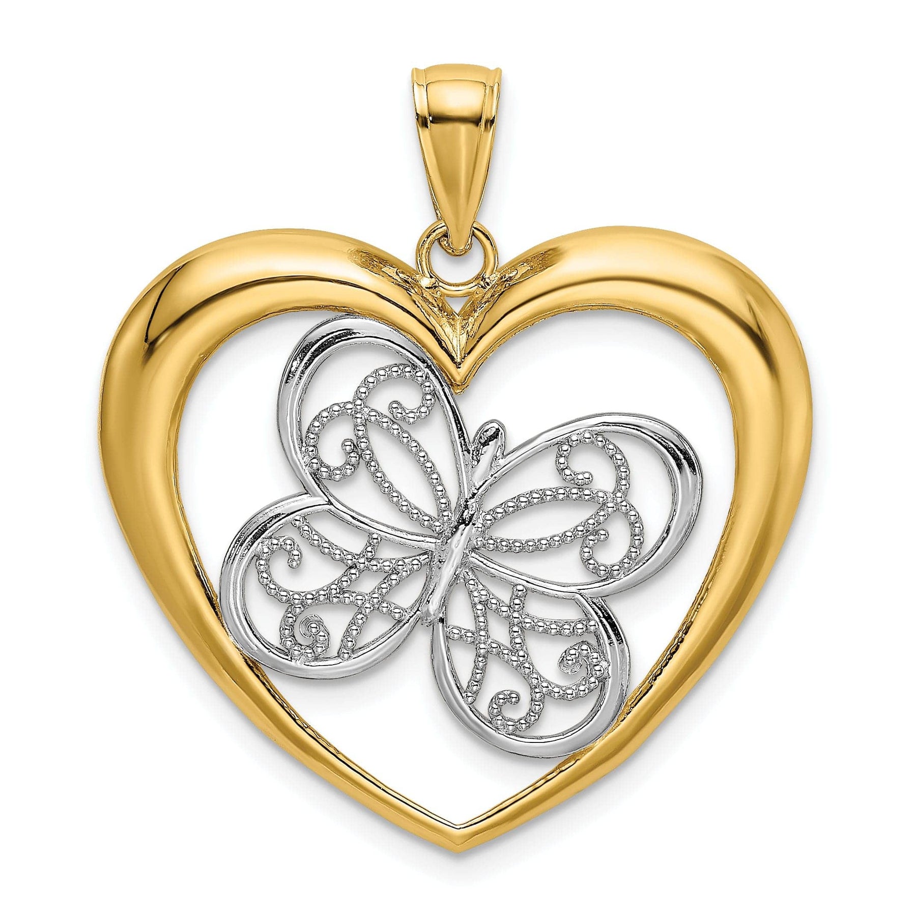 14k Two-tone Gold Textured Open Back Filigree Solid Polished Finish Butterfly in Heart Charm Pendant
