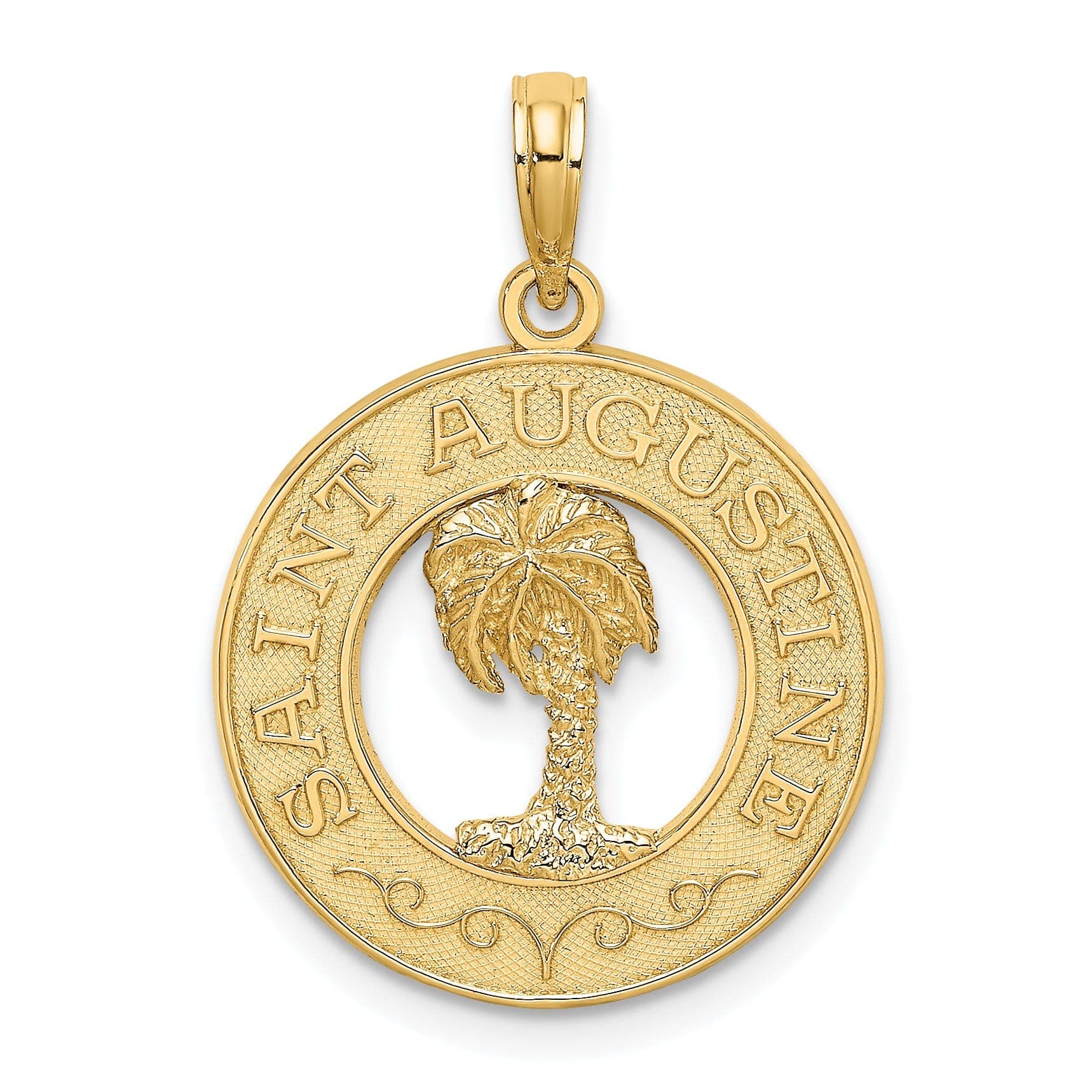 Elevate your jewelry collection with this stunning 14K Yellow Gold Polished Textured Finish SAINT AUGUSTINE FLORIDA Banner Palm Tree Circle Design Charm Pendant. Crafted with precision and attention to detail, this pendant features a unique design that captures the essence of Saint Augustine, Florida.