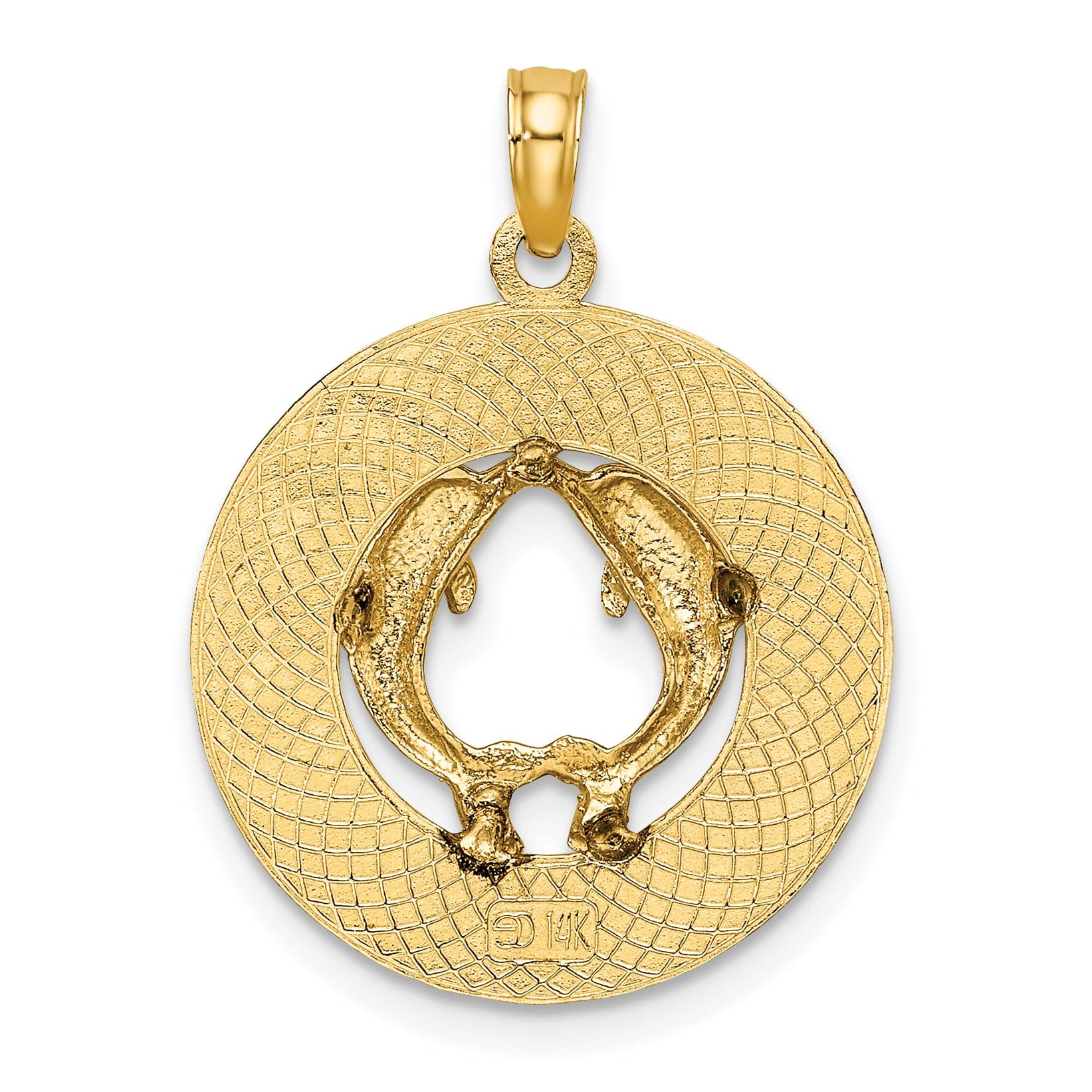 14K Yellow Gold Textured Polished Finish KENNEBUNKPORT Maine with Double Dolphins in Circle Design Charm Pendant