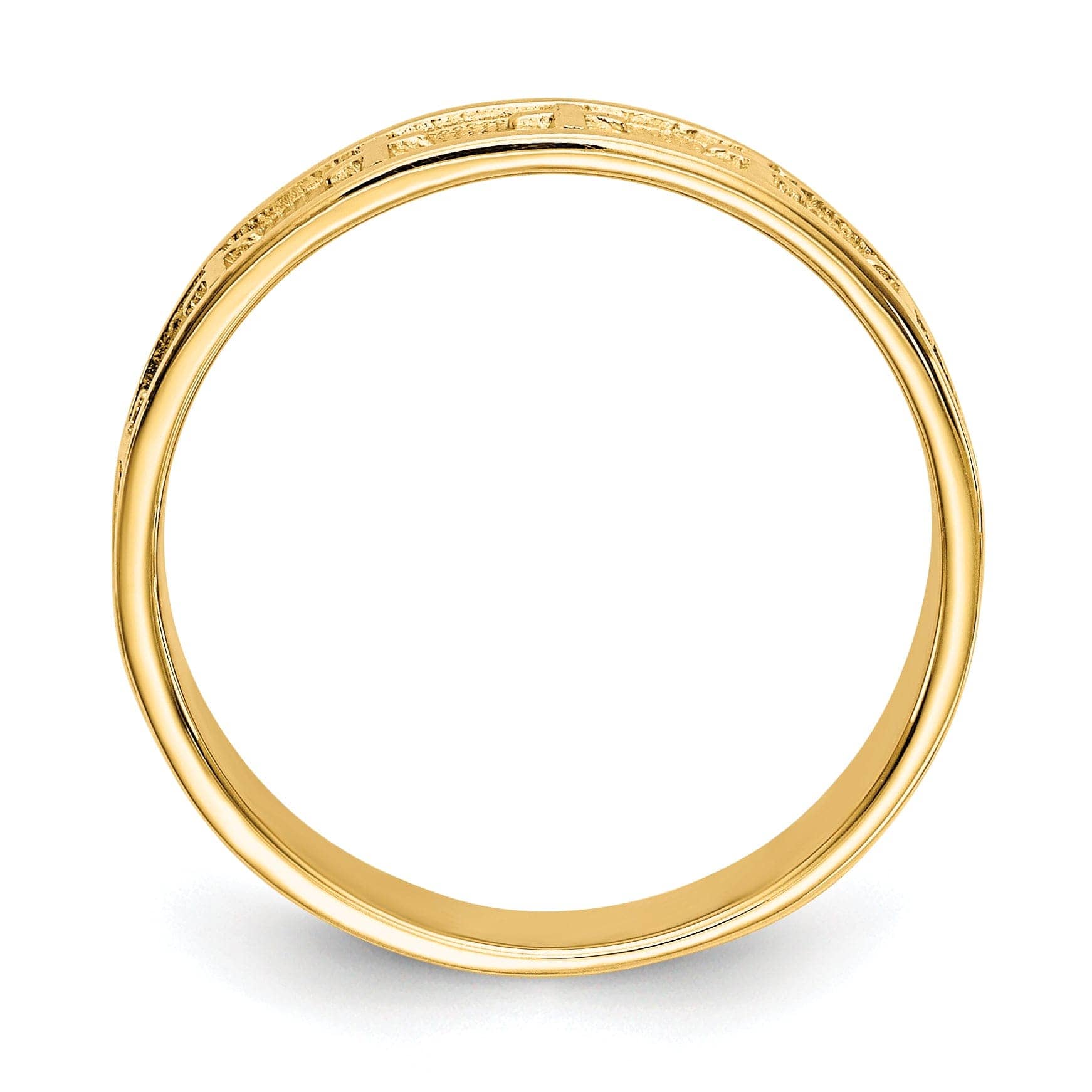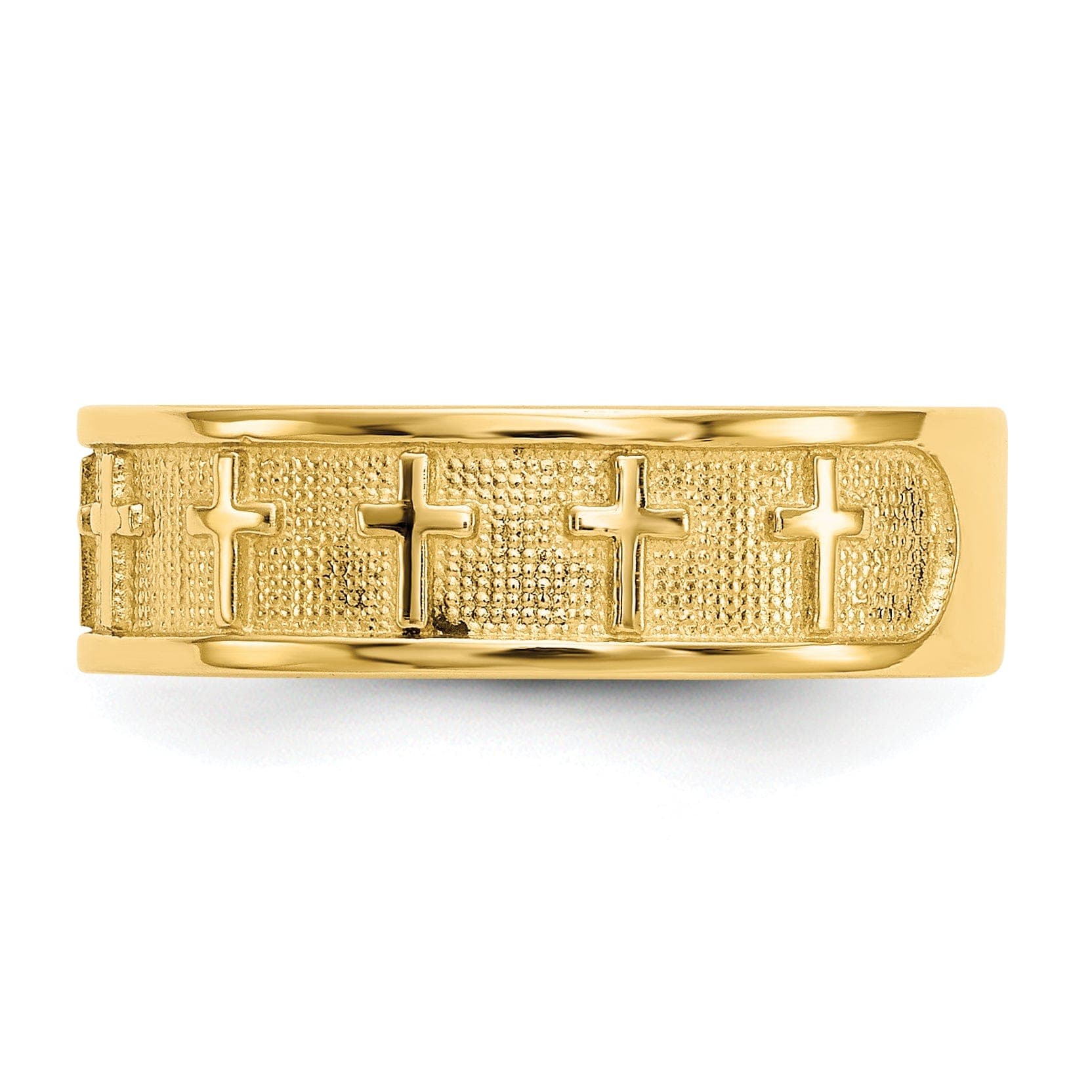 Whether you choose to wear this band as a symbol of your faith or simply as a stylish accessory, it is sure to catch the eye and become a favorite in your jewelry collection. Perfect for everyday wear or special occasions, this 14k yellow gold polished satin cross band is a versatile piece that will complement any outfit.