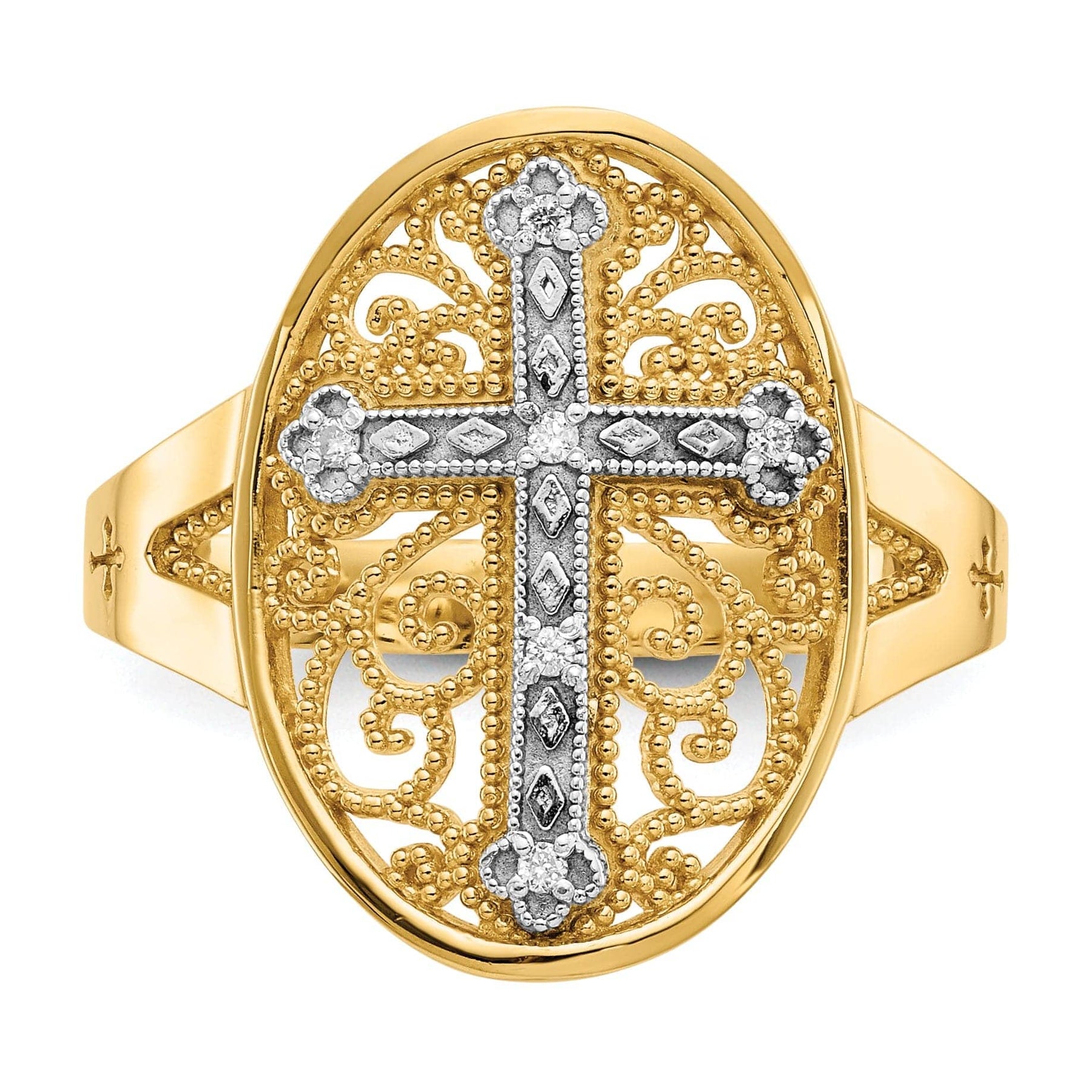 Introducing our stunning 14kt yellow white gold diamond filigree cross ring, the perfect symbol of faith and style. Crafted with the highest quality materials, this exquisite ring features a beautiful cross design with intricate filigree detailing. The shimmering diamonds add a touch of elegance and sophistication, making this ring a truly special piece.