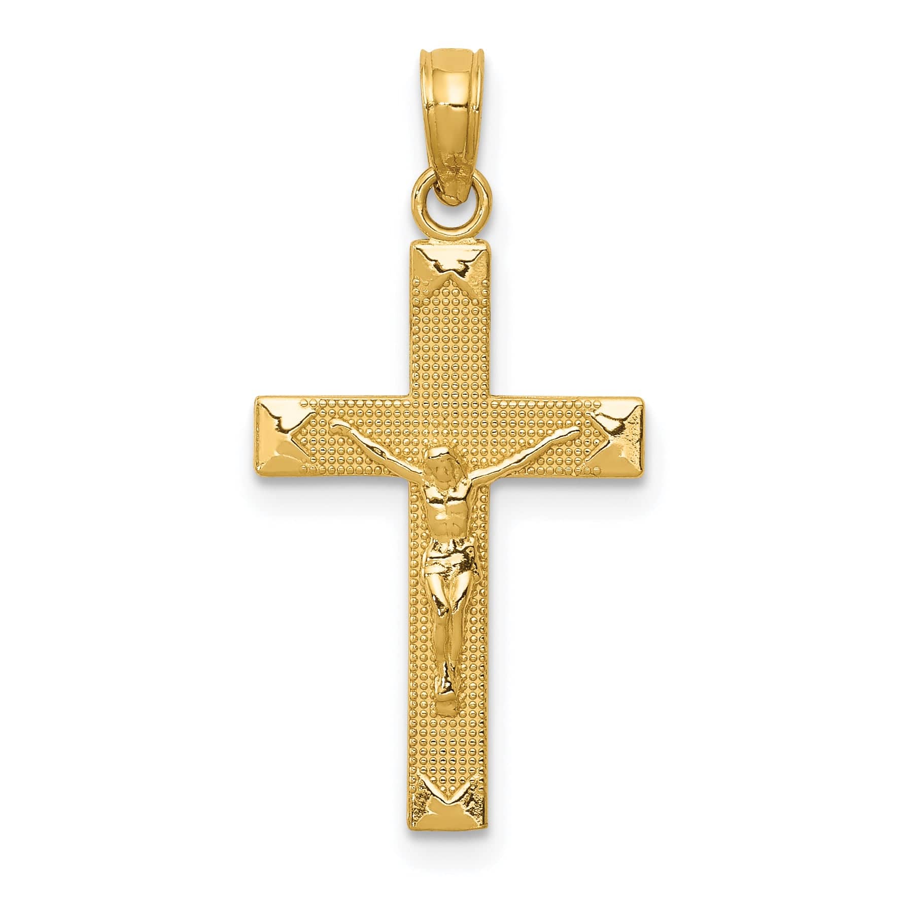 Elevate your jewelry collection with this exquisite 14K Yellow Gold Classic Beveled Tipped Crucifix Cross Pendant. Crafted from solid 14K yellow gold, this pendant features a polished finish and textured details that enhance its classic design. Measuring 26 mm in length and 13 mm in width, with a 4 mm bail for easy attachment to your favorite chain, this piece is both durable and timeless. Weighing just 0.95 grams, it offers a lightweight wear while making a meaningful statement.