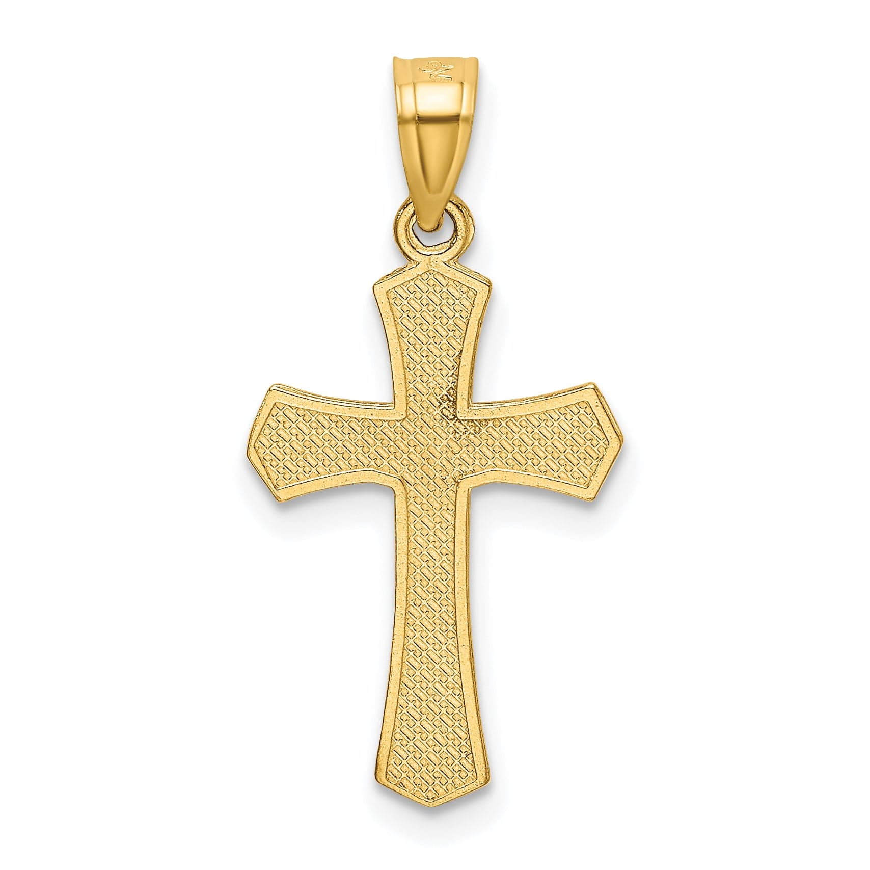 Elevate your style with the 14K Yellow Gold Classic D.C Crucifix Cross Pendant. Crafted from solid 14K yellow gold, this stunning pendant features a polished, diamond-cut texture that catches the light beautifully. Measuring 25.5 mm in length and 13 mm in width, it is delicately designed with a 6 mm bail for easy attachment to your favorite chain. Weighing just 0.76 grams, this timeless piece combines durability with elegance, making it a perfect addition to any jewelry collection.