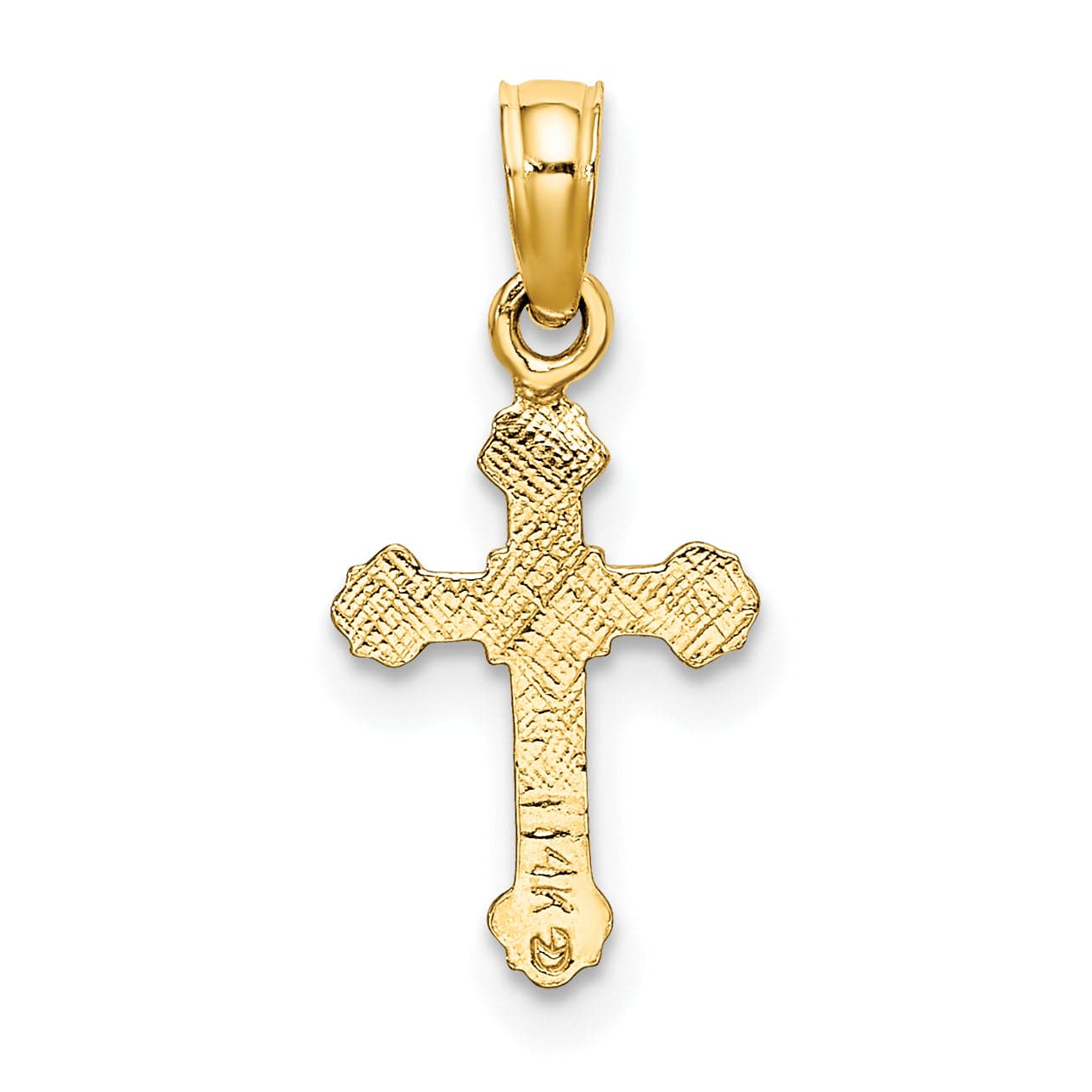 Elevate your jewelry collection with the 14K Yellow Gold Classic Mini Fancy Tips Crucifix Cross. This exquisite pendant features a polished finish, showcasing its solid durability and beautiful textured design. Compact yet striking, it measures 17 mm in length and 9 mm in width, making it a perfect accessory for any occasion. With a lightweight feel of just 0.27 grams, this 14K yellow gold piece combines elegance and comfort effortlessly.