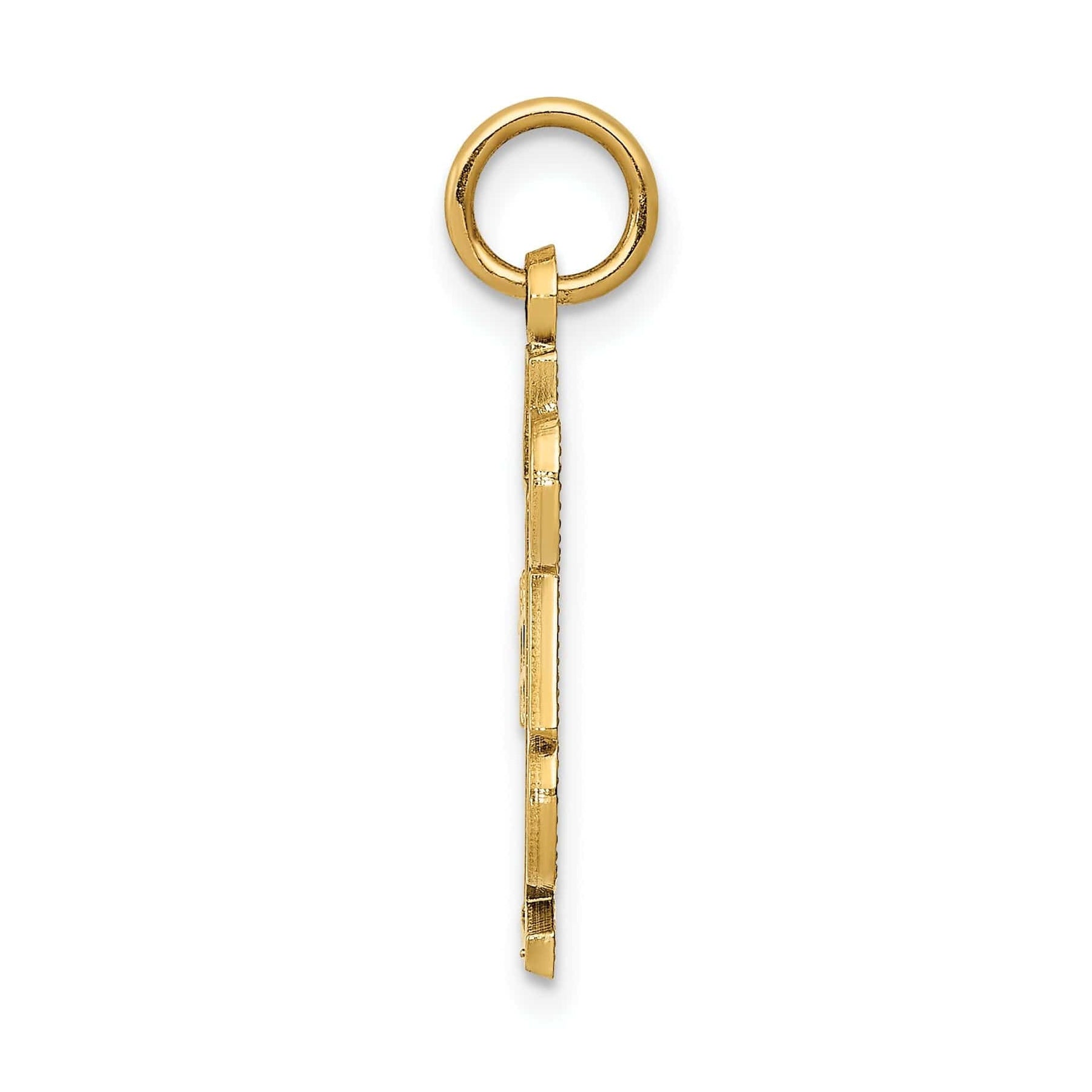 Introducing our stunning 14k Yellow Gold Polished Beaded Textured Finish Vertical Style Script #1 DAD Charm Pendant. This elegant pendant is the perfect way to show your love and appreciation for the number one dad in your life. Crafted from high-quality 14k yellow gold, this pendant features a polished beaded textured finish for a luxurious look and feel.