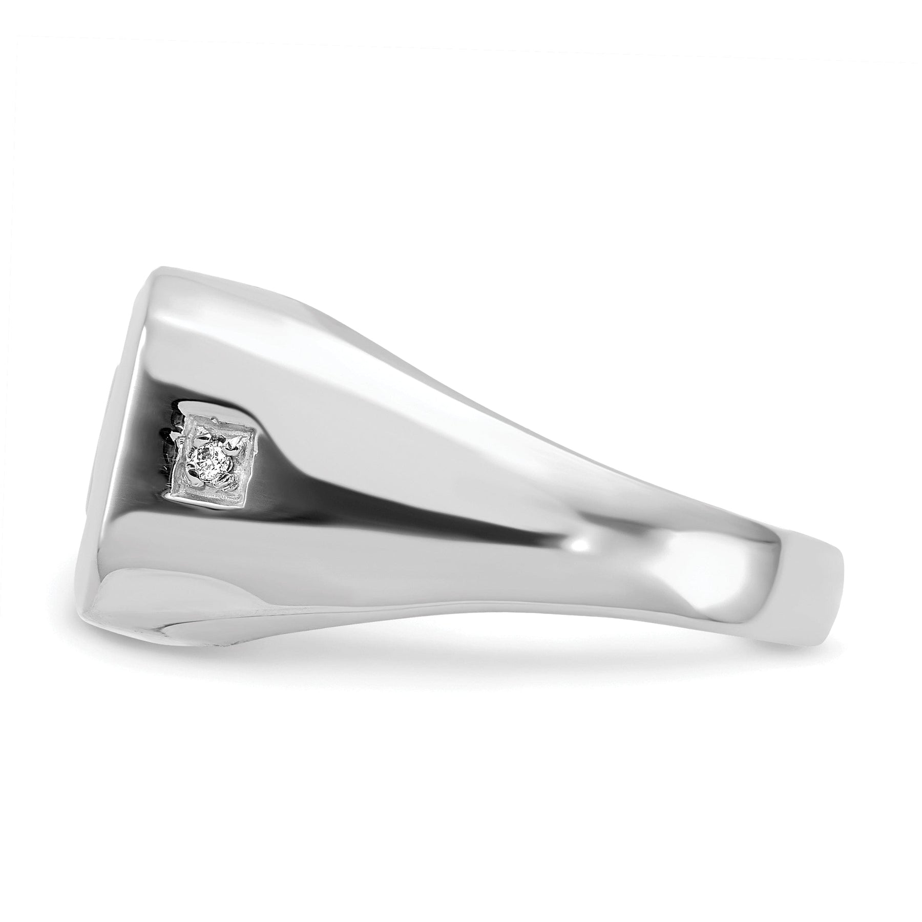 This stunning 14k white gold men's ring is the perfect accessory for any father. The ring features a bold, rectangular onyx stone at its center, surrounded by a halo of sparkling diamond accents. The word "DAD" is intricately engraved on the side of the band, making this ring a special and sentimental gift for any dad.