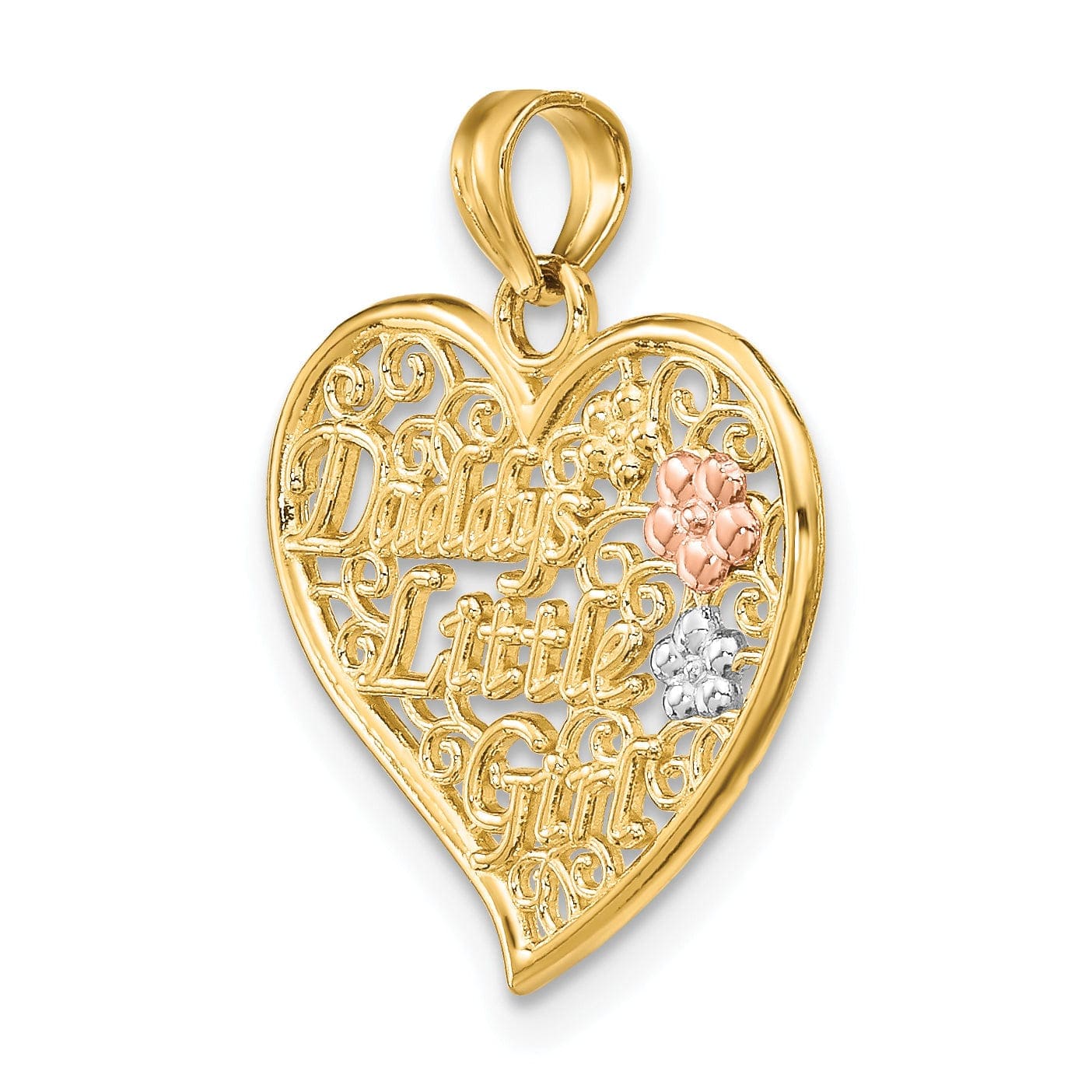 14k Two Tone Gold, White Rhdoium DADDYS LITTLE GIRL with Flowers Fancy Filigree Design Heart Charm Pendant