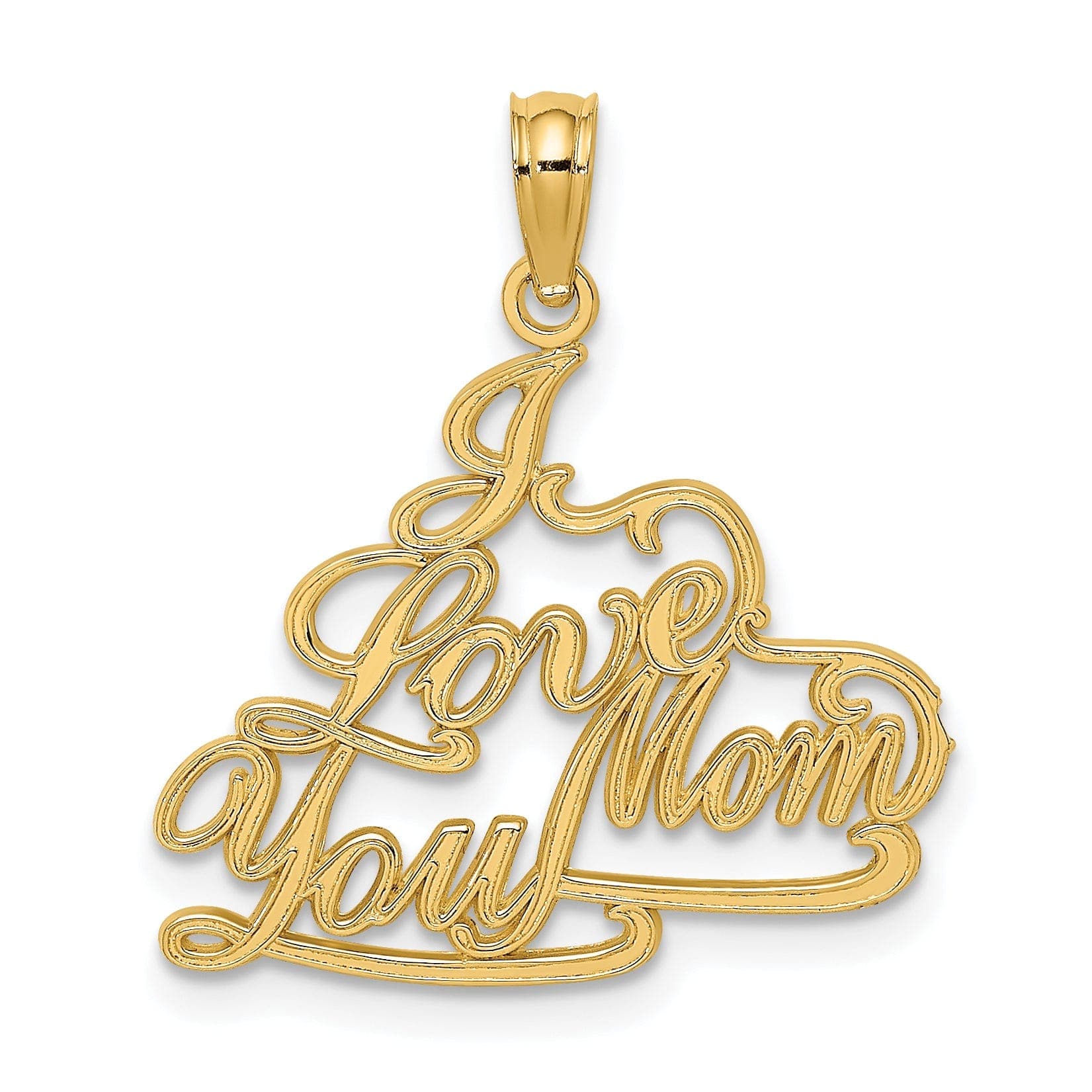 14k Yellow Gold Flat Back Polished Finish in Script I LOVE YOU MOM Charm Pendant Design