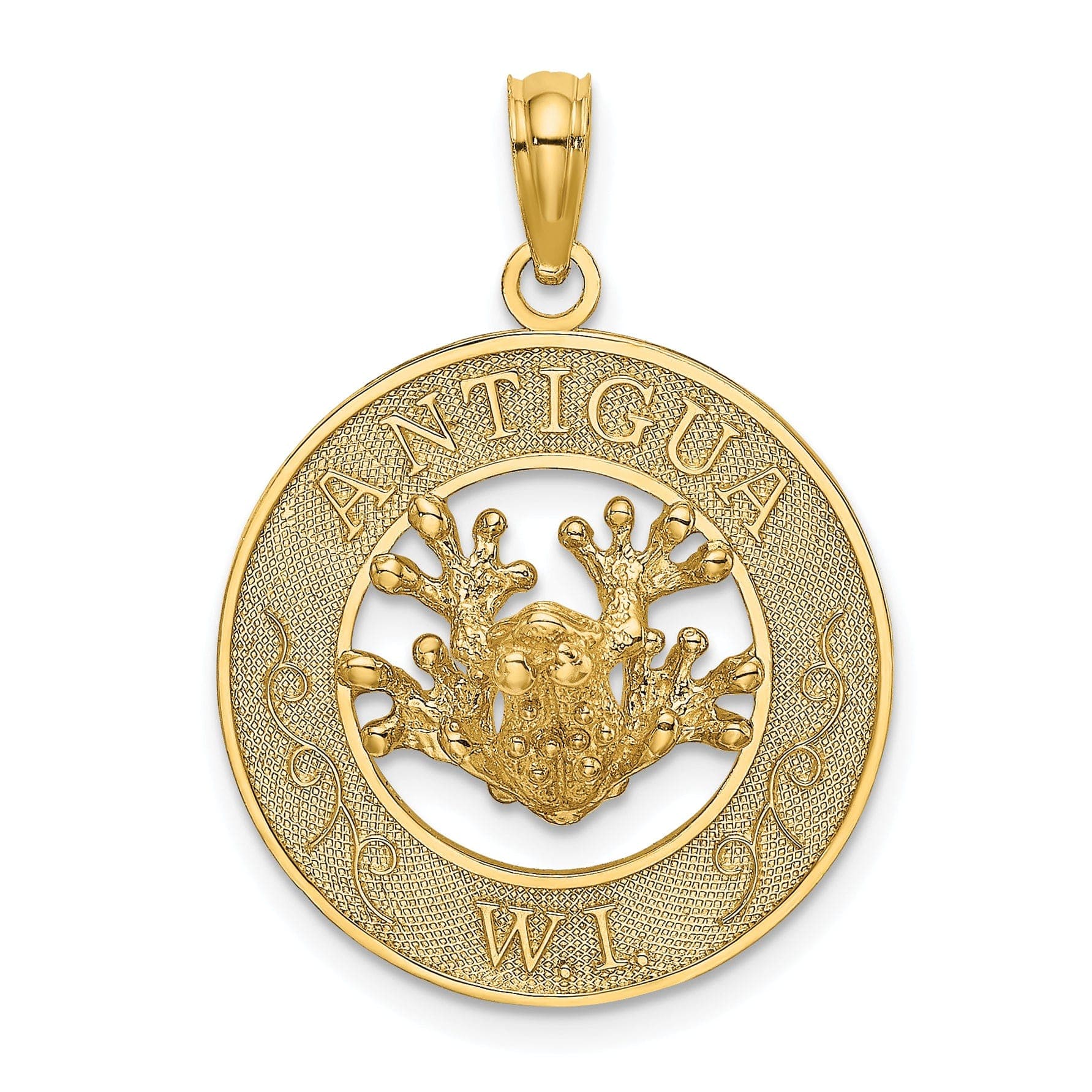 14K Yellow Gold Polished Finish Close Back ANTIGUA, W.I Circle Design with Frog Charm Pendant