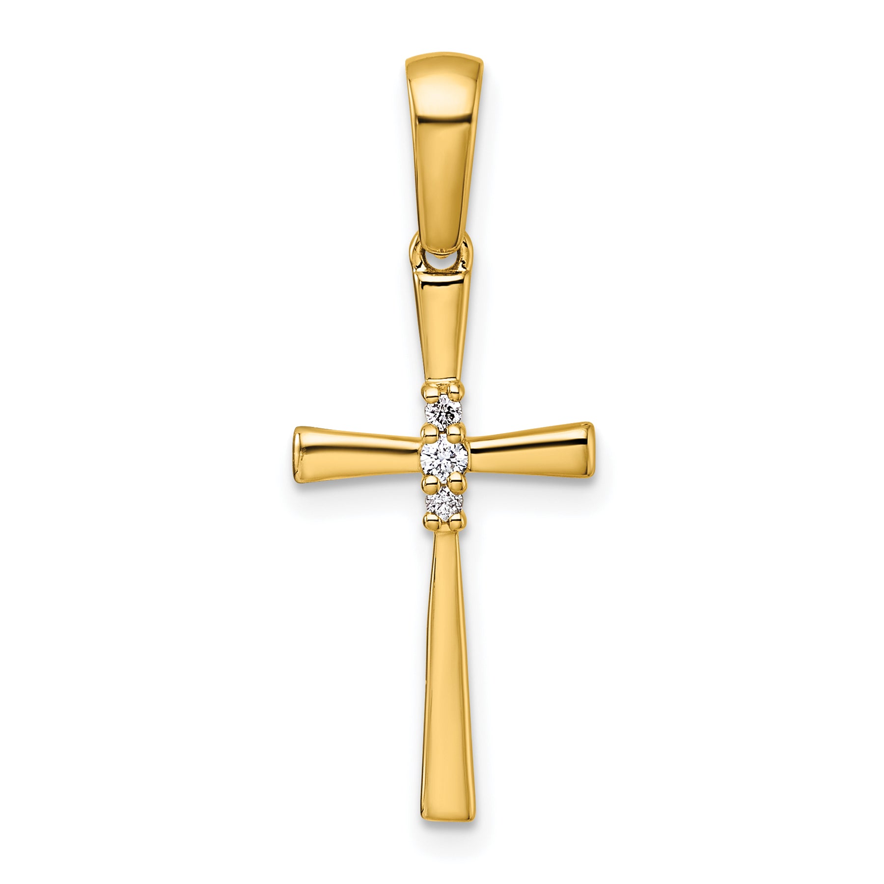 Elevate your elegance with our 14K Yellow Gold Modern Design Cross Pendant, featuring a stunning 1/20 carat diamond. Crafted from solid 14K yellow gold, this polished pendant has a weight of 1.38 grams and measures 30.2 mm in length, 12.1 mm in width, and 3 mm in thickness. With three sparkling diamonds set in a contemporary design, this piece is perfect for both everyday wear and special occasions. The bail measures 8.2 mm in length and 3 mm in width, ensuring a secure fit on your favorite chain. Make a statement of faith and style with this exquisite pendant.