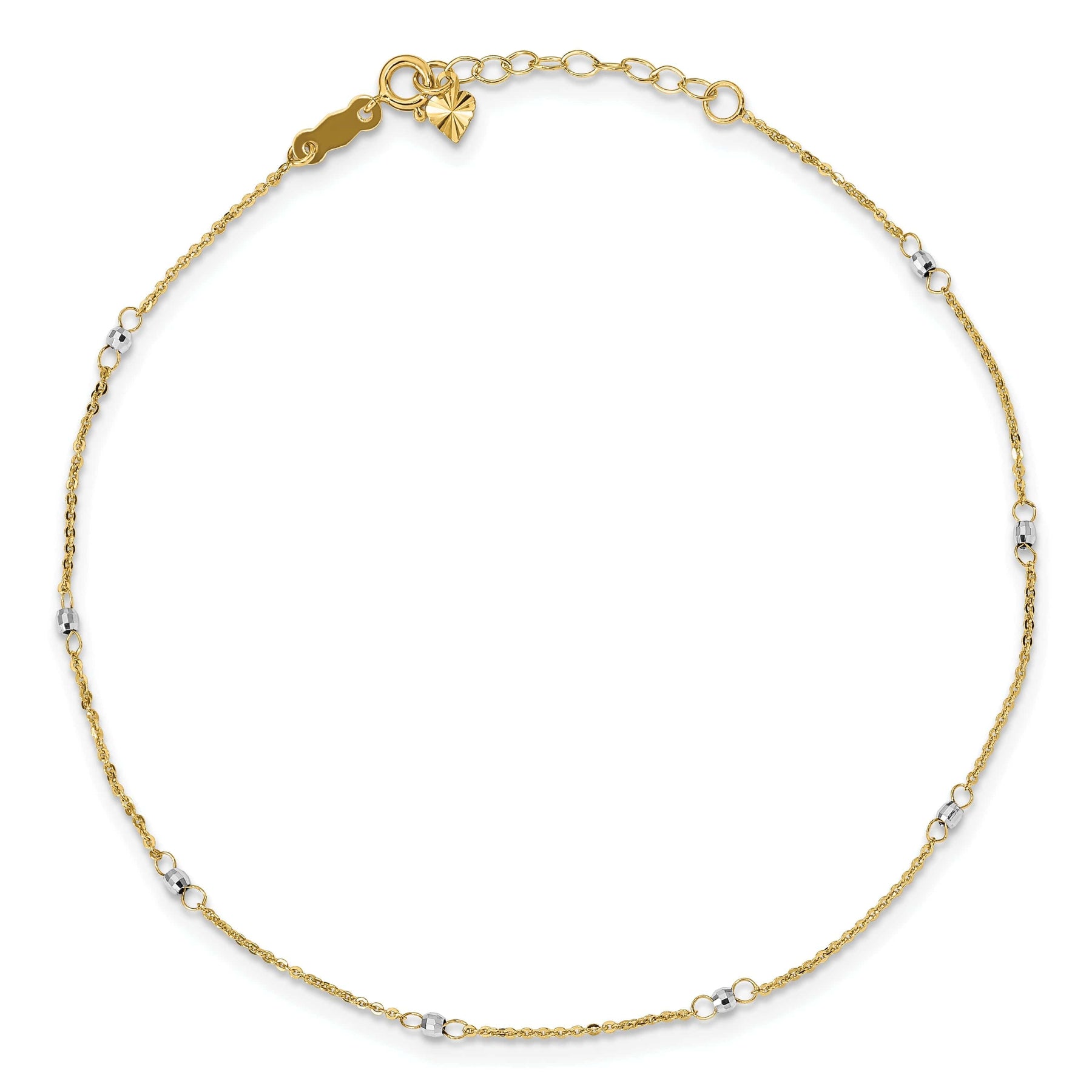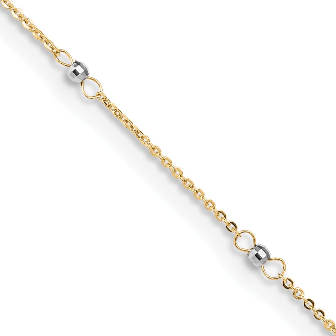 Elevate your style with this stunning 14k Yellow White Gold Cable Two-tone Anklet with Mirror Beads. This exquisite anklet features a unique design, combining the classic elegance of yellow and white gold with shimmering mirror beads that catch the light beautifully.