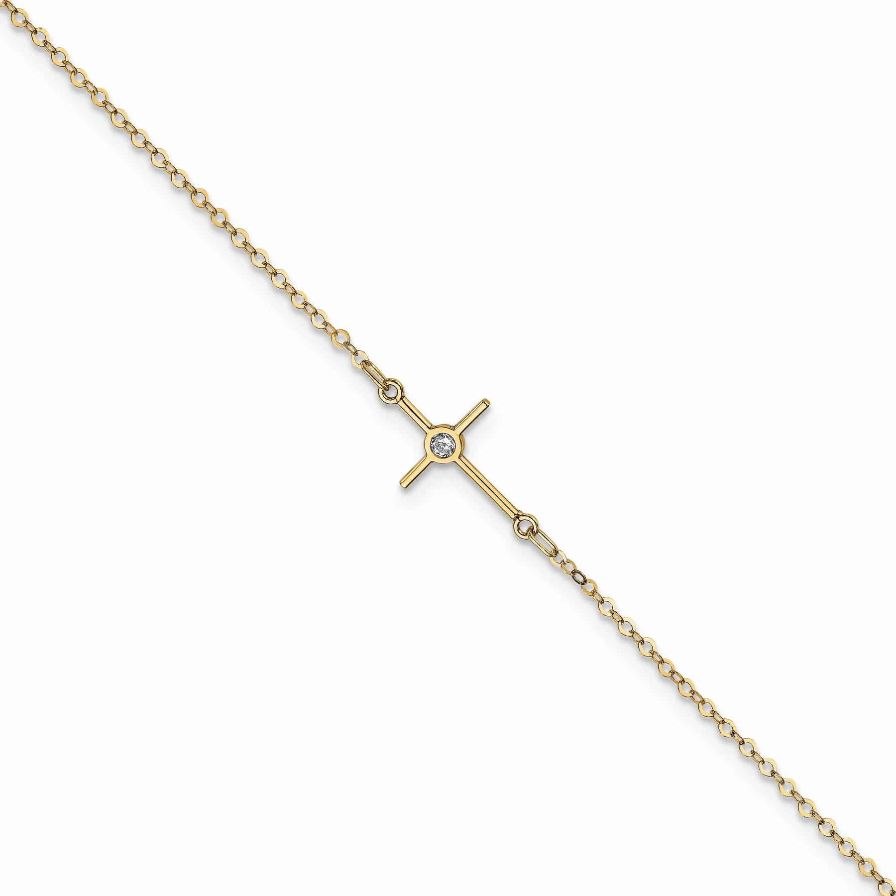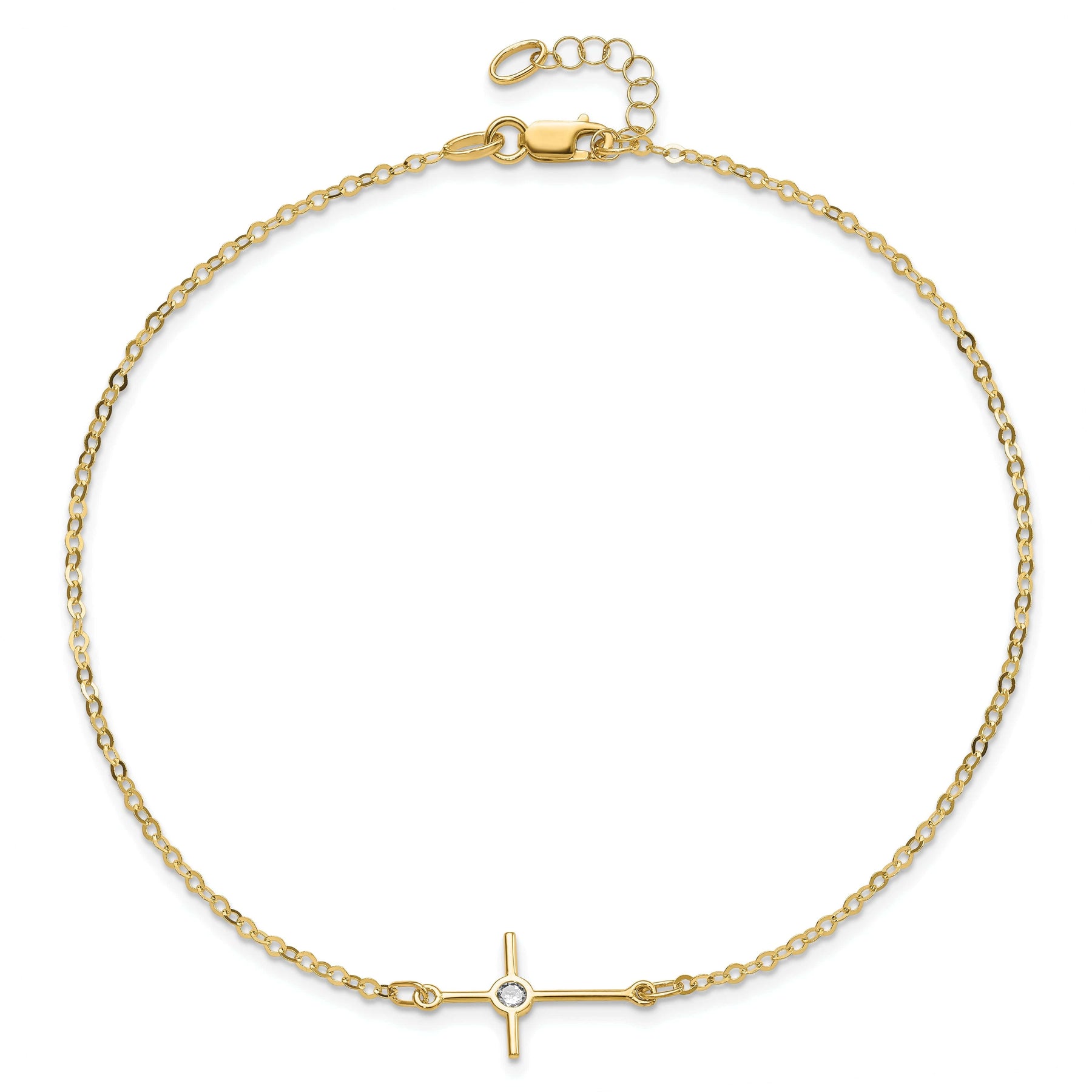 Add a touch of faith and beauty to your ensemble with Leslie's 14k Yellow Gold Polished Finish Cubic Zirconia Cross Anklet. This piece is not only a fashion statement but also a symbol of your personal style and beliefs. Make a statement and shine bright with this stunning anklet.