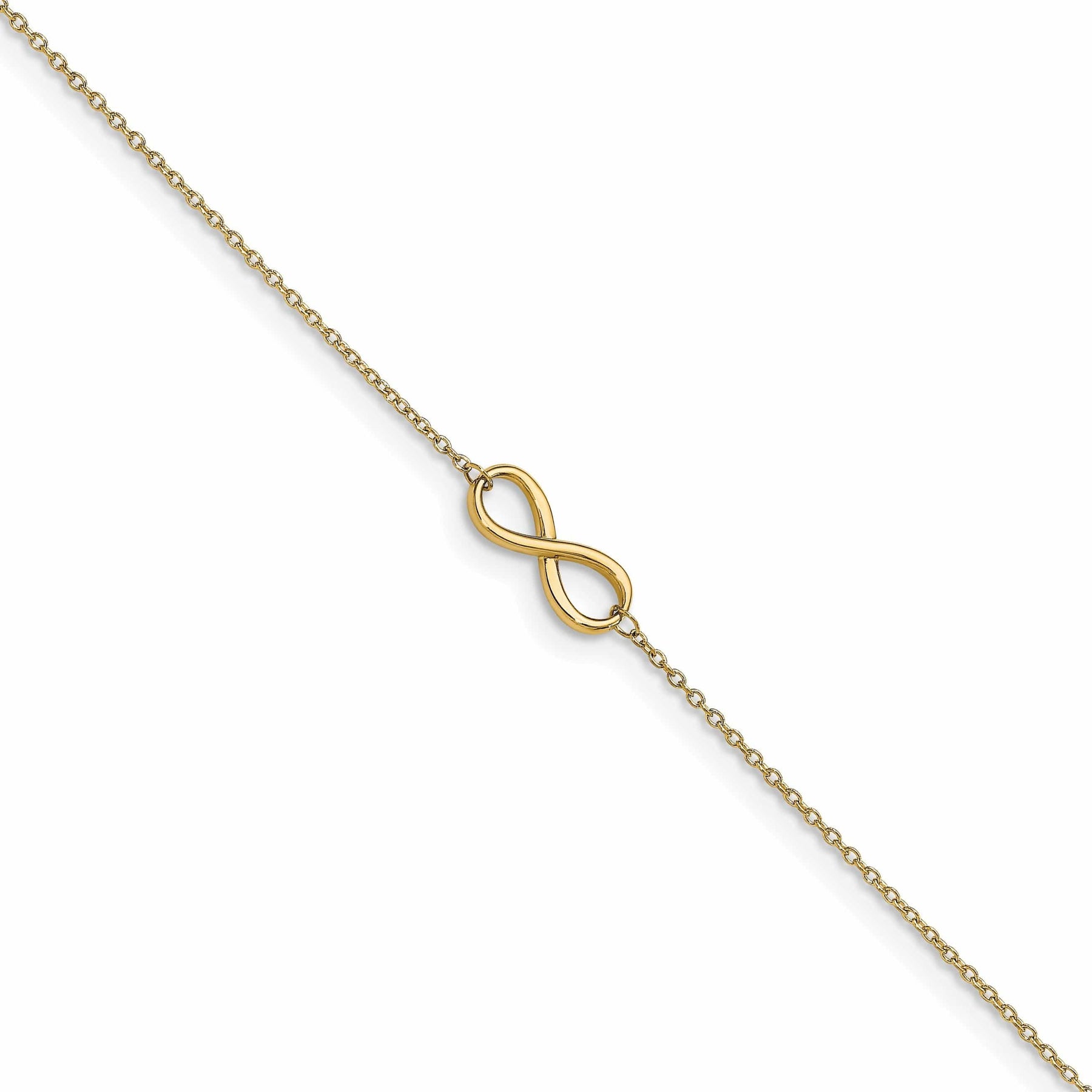 Introducing Leslie's exquisite 14k Yellow Gold Polished Finish Infinity Anklet with a 1 inch extender. This stunning piece of jewelry is the perfect accessory for any occasion, adding a touch of elegance and sophistication to any outfit.