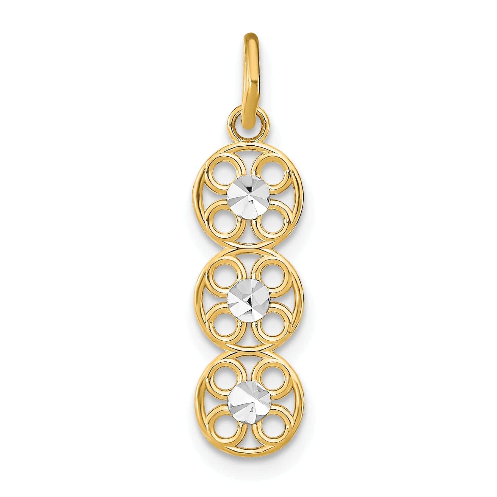 14K Yellow Gold, White Rhodium Polished Diamond Cut Finish Filigree 3 Circle Design Pendant