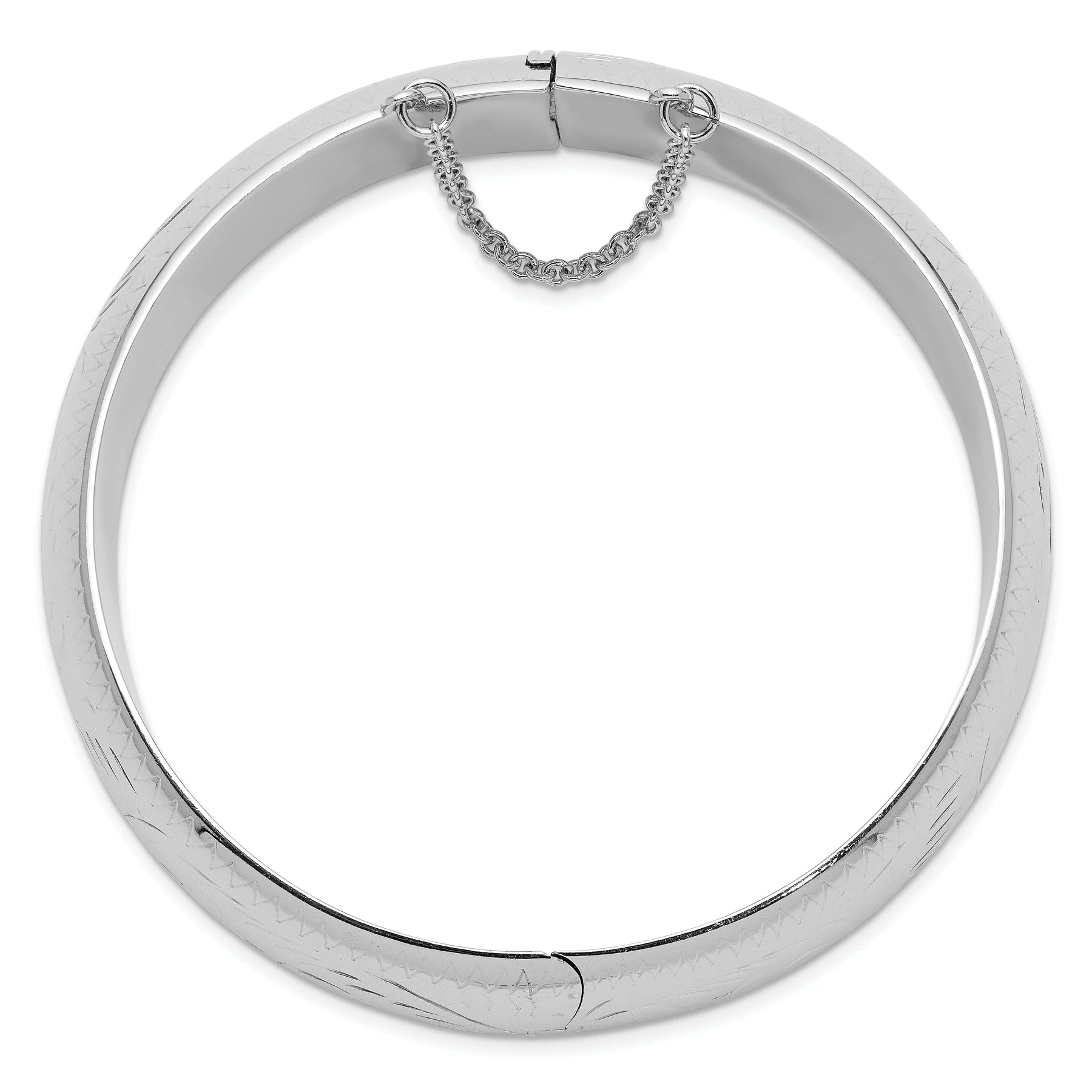 Introducing our stunning Silver Diamond Cut Fancy Hinged Bangle Bracelet, a versatile and timeless piece of jewelry that will elevate any outfit. Crafted from high-quality sterling silver, this bracelet is rhodium plated to give it a lustrous shine and added durability.
