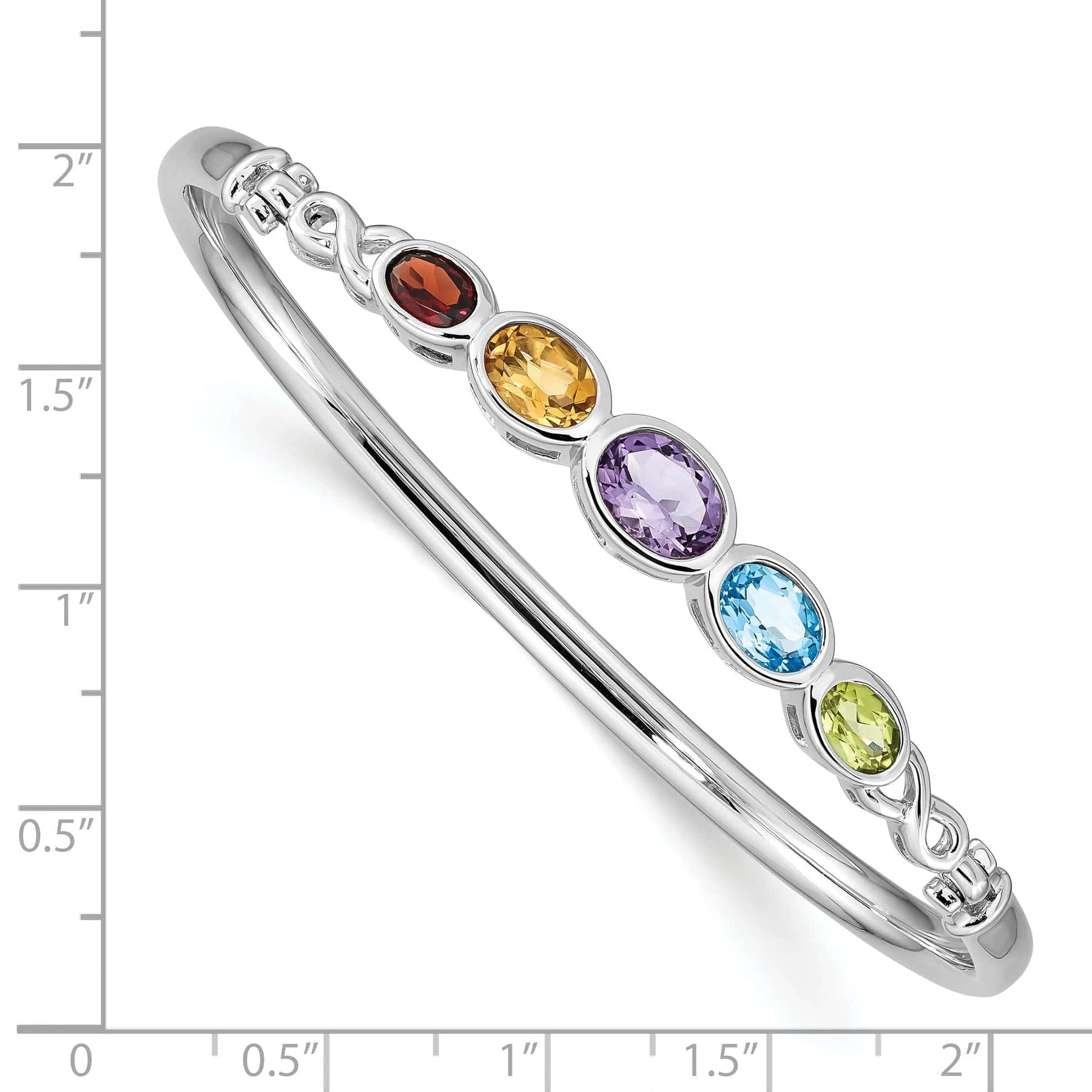 The bracelet features an array of vibrant multi-colored gemstones, including amethyst, citrine, peridot, blue topaz, and garnet, all carefully set in a sleek hinged bangle design. Each gemstone is expertly cut and faceted to catch the light and showcase their natural beauty.