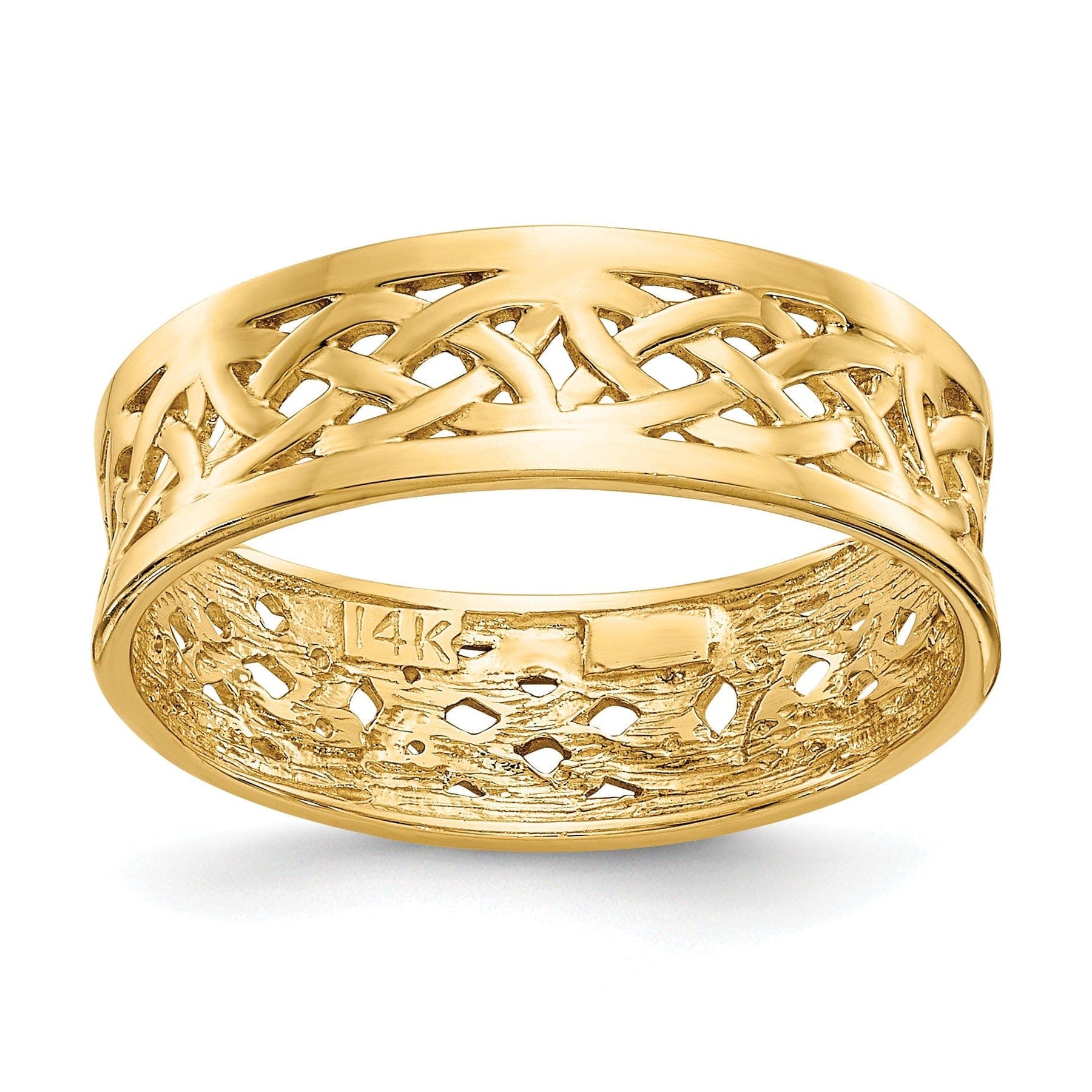 Elevate your jewelry collection with this timeless 14k Yellow Gold Polished Celtic Knot Band Ring. Crafted from high-quality solid gold, this ring boasts a stunning polished finish that radiates brilliance. The 6mm wide band showcases intricate Celtic knot detailing, symbolizing interconnectedness and everlasting love.
