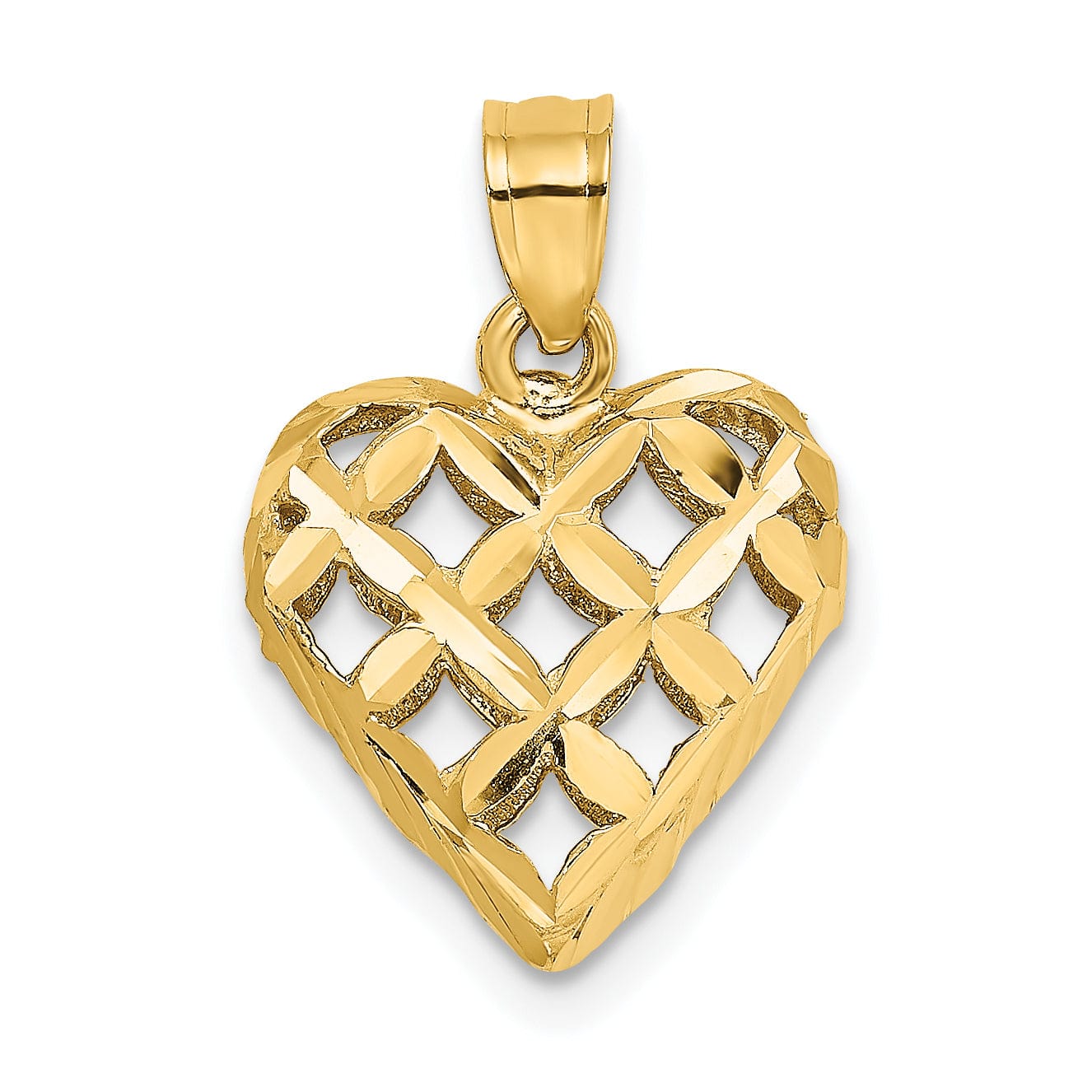 Whether you're treating yourself or looking for the perfect gift for a loved one, this 14k Yellow Gold 3-D Diamond-Cut Filigree Puffed Heart Pendant is sure to impress. Add it to your jewelry collection today and elevate any outfit with its charm and beauty.