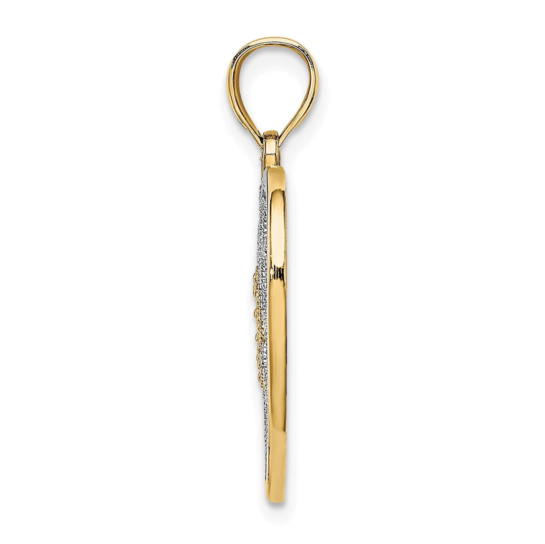 Introducing our stunning 14k Yellow Gold Rhodium Filigree Heart Pendant, a timeless piece that exudes elegance and sophistication. Crafted from high-quality 14k yellow gold with a rhodium finish, this pendant is polished to perfection for a dazzling shine that will last a lifetime.