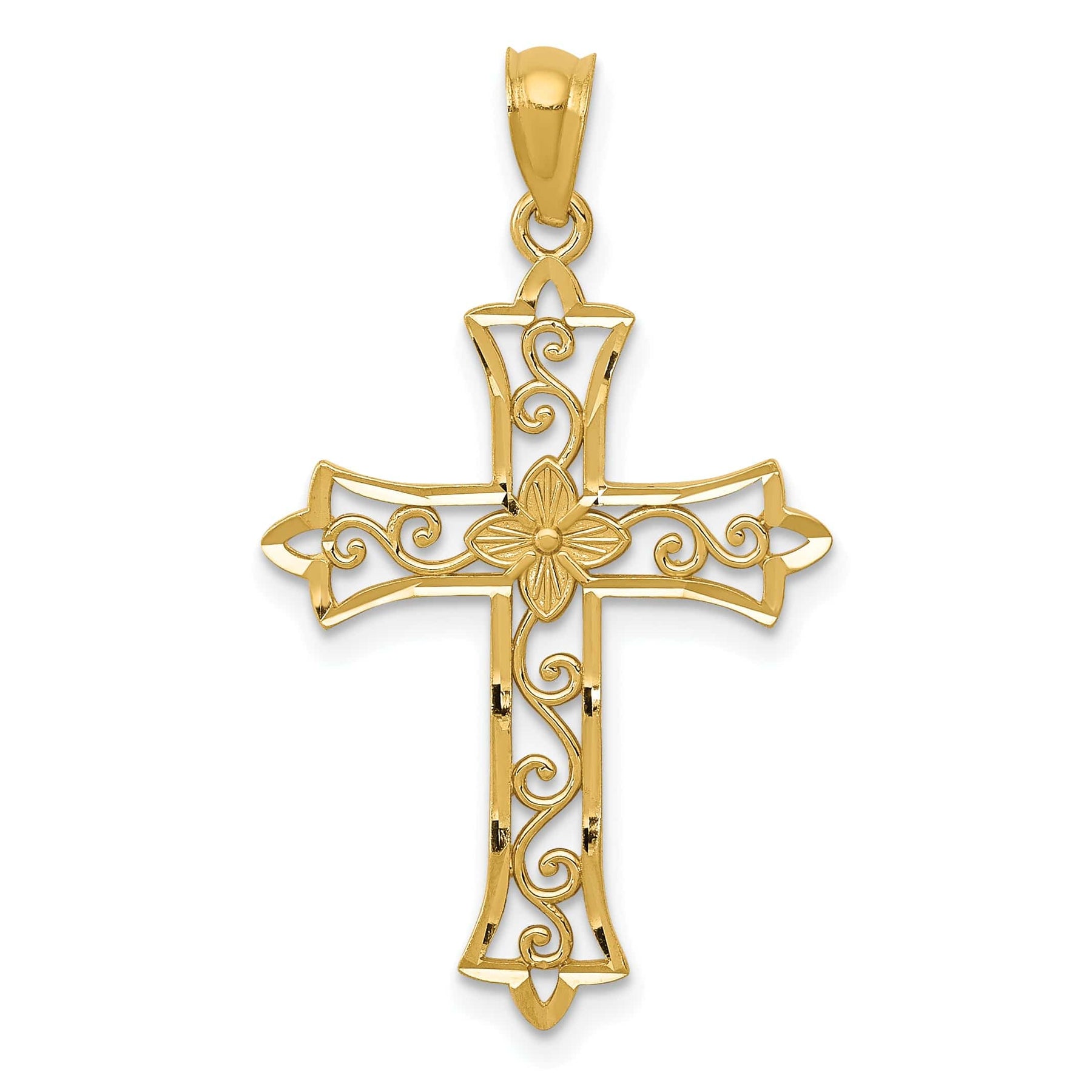 Elevate your faith and style with the 14K Yellow Gold Classic Flower Scrolled Fleur de Lis Cross Pendant. This exquisite piece features a diamond-cut flower center and a beautifully scrolled design, all crafted from solid 14K yellow gold for lasting durability. Measuring 25 mm in length and 18 mm in width, it is a perfect statement piece that combines elegance with a meaningful symbol.