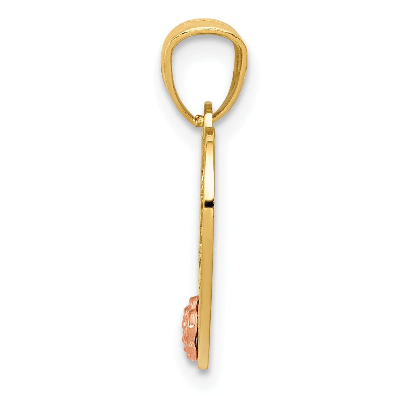 Made with high-quality 14k two tone gold, this pendant exudes elegance and sophistication. The contrast between the white gold letters and the yellow gold heart adds a unique and eye-catching element to this piece.