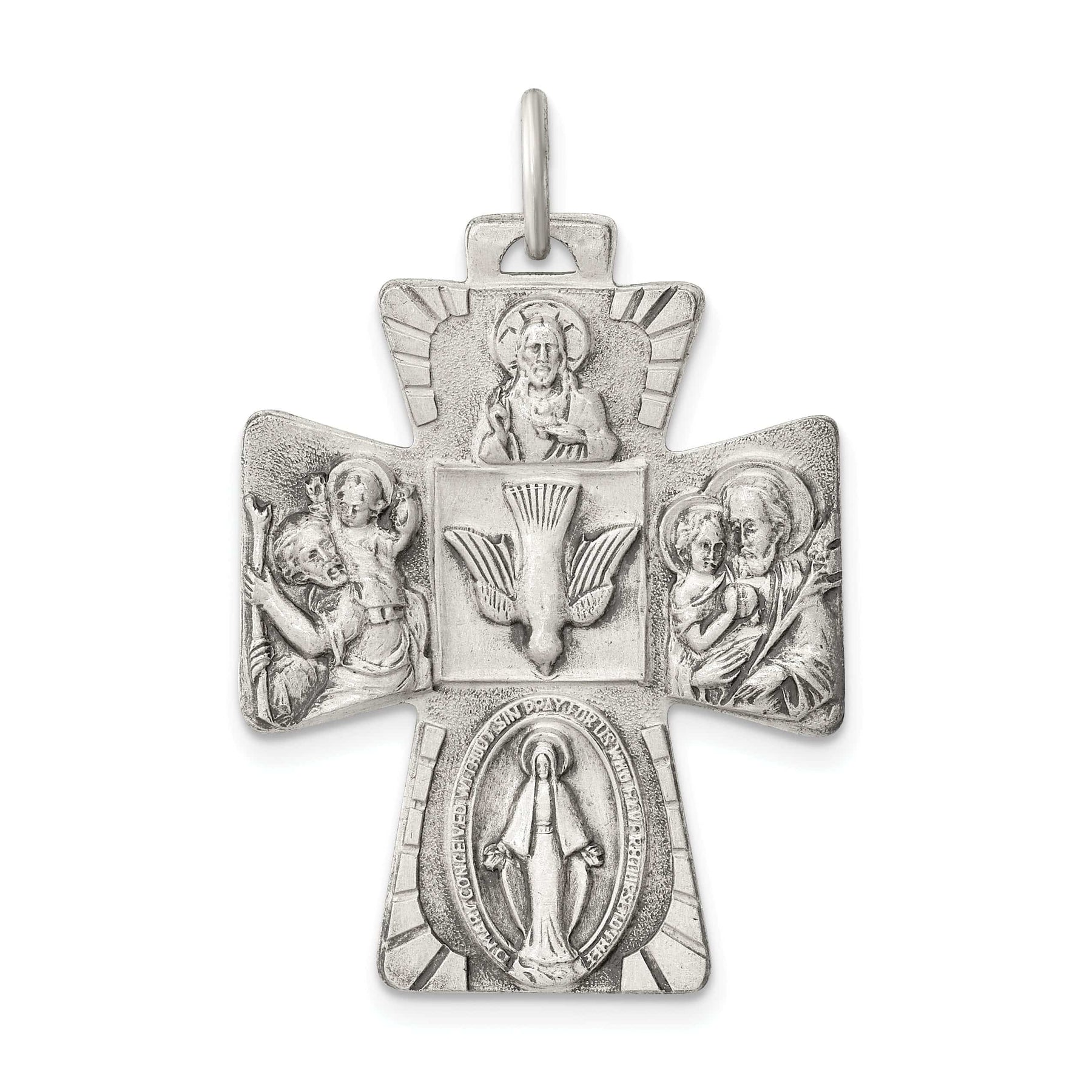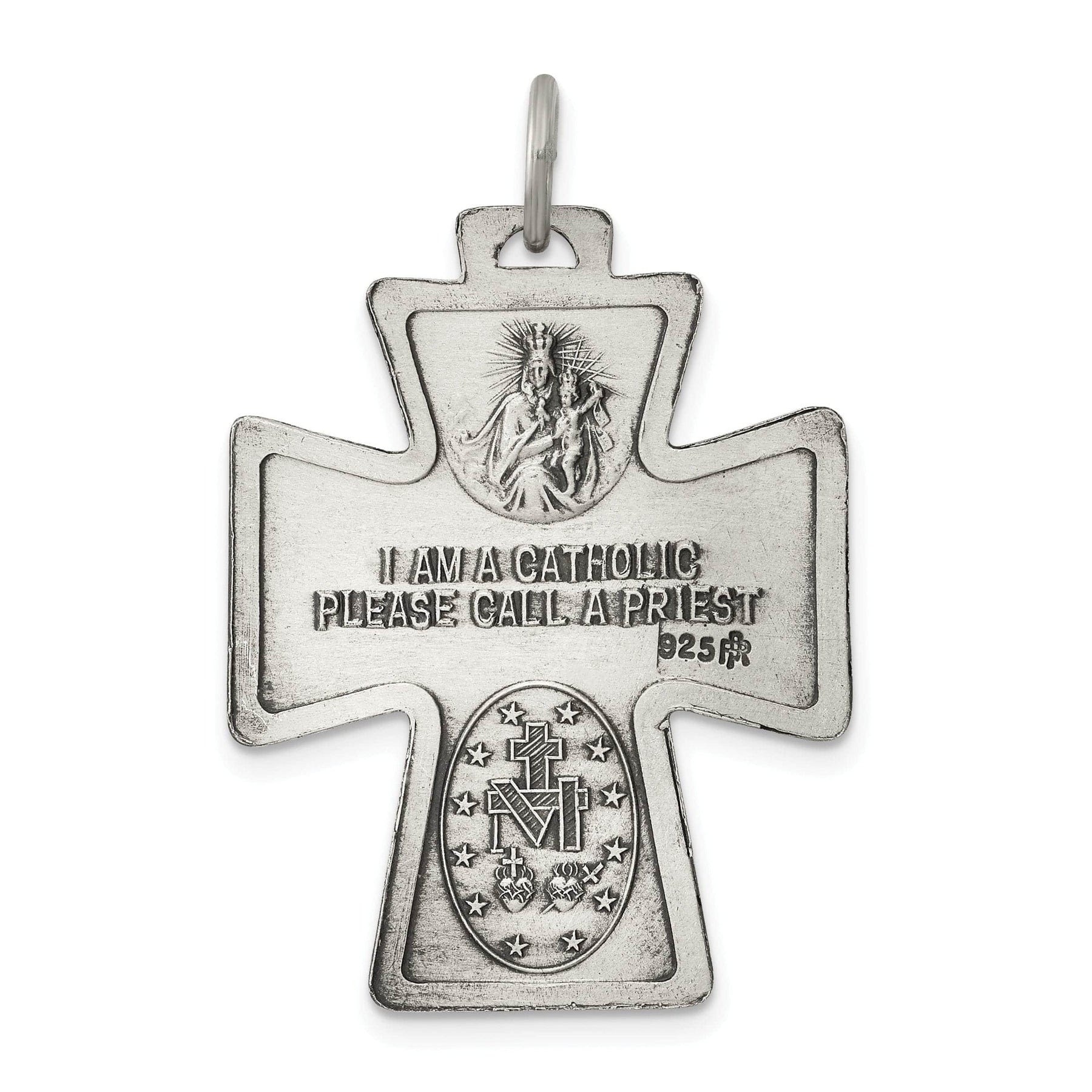 Introducing our exquisite Sterling Silver Antiqued 4-way Medal, a stunning piece of religious jewelry that is sure to become a cherished keepsake for years to come. Crafted from high-quality sterling silver, this medal has an average weight of 5.47 grams, giving it a substantial feel that is both durable and long-lasting.