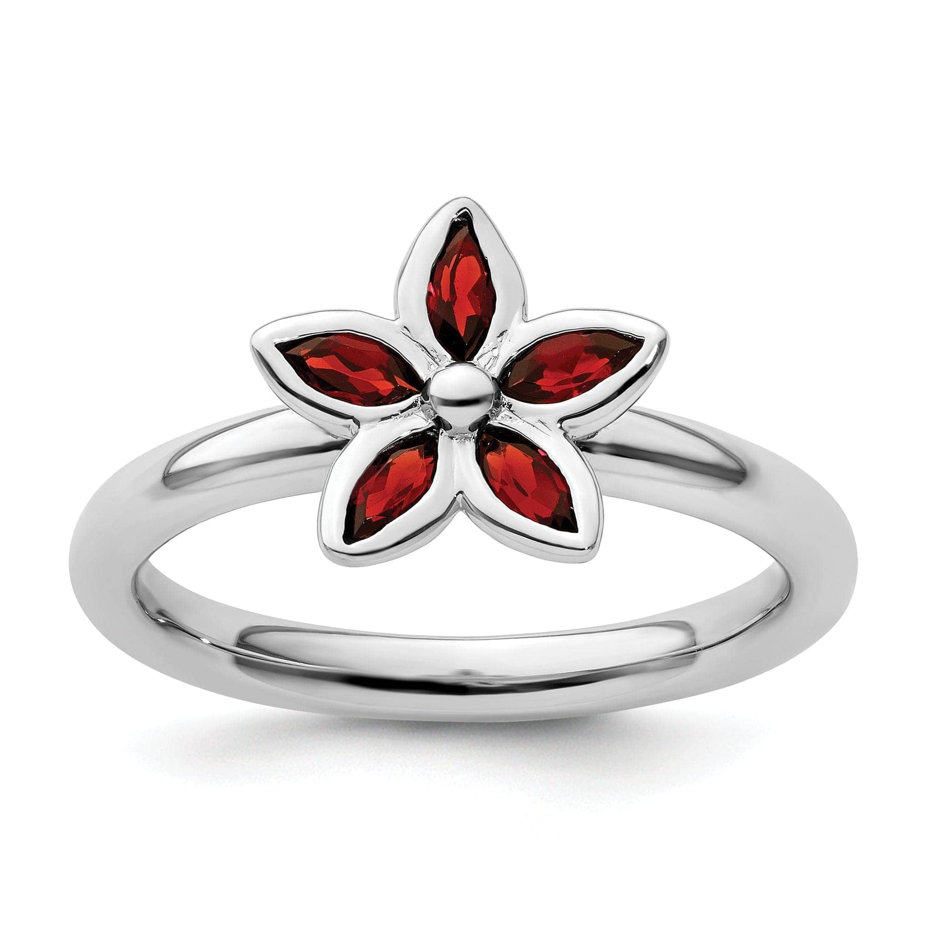Whether you wear it on its own or paired with other rings, this Sterling Silver Stackable Expressions Garnet Flower Ring is sure to turn heads and make a statement. Treat yourself or a loved one to this beautiful piece of jewelry that will be cherished for years to come.